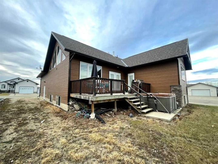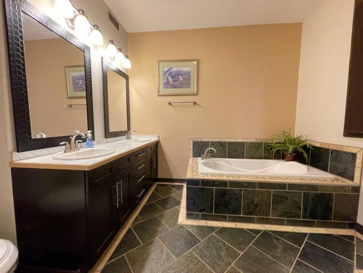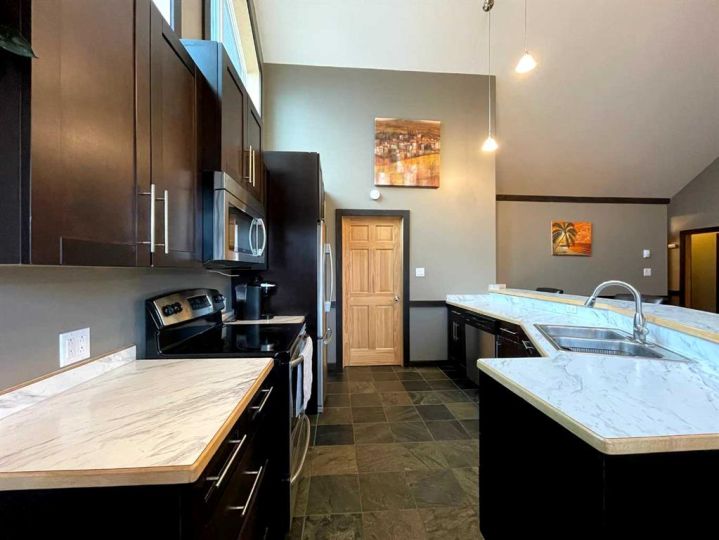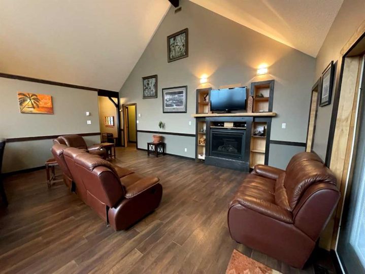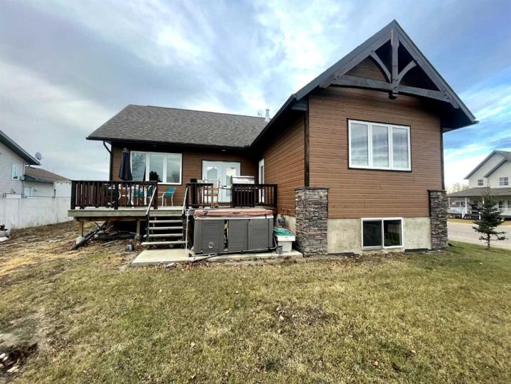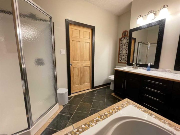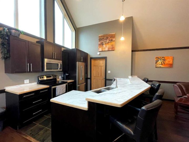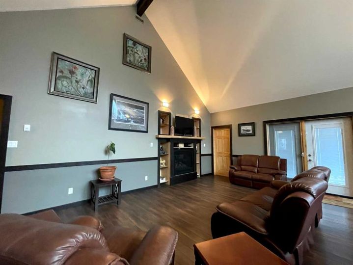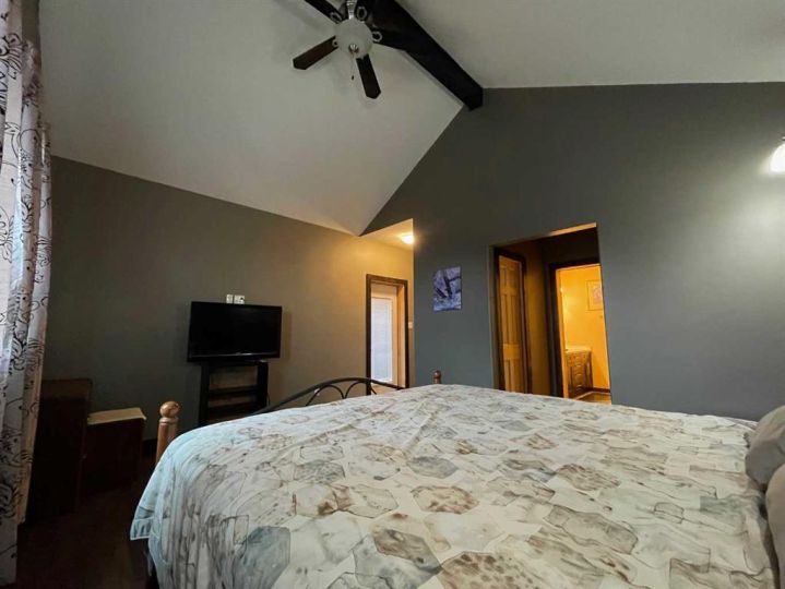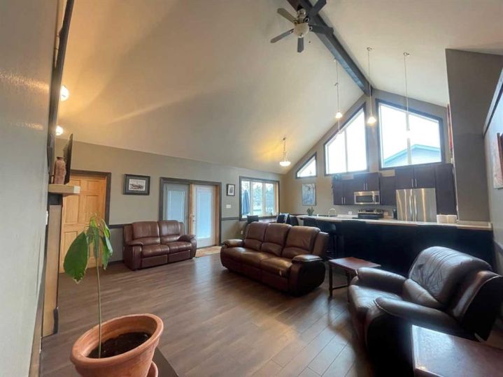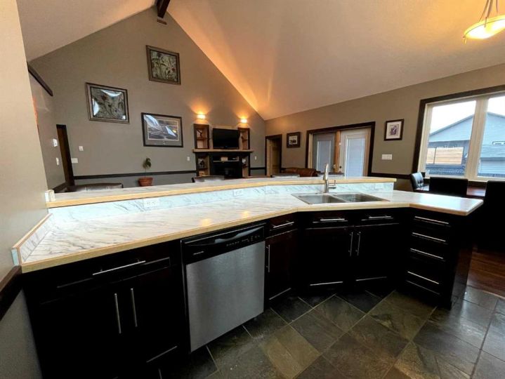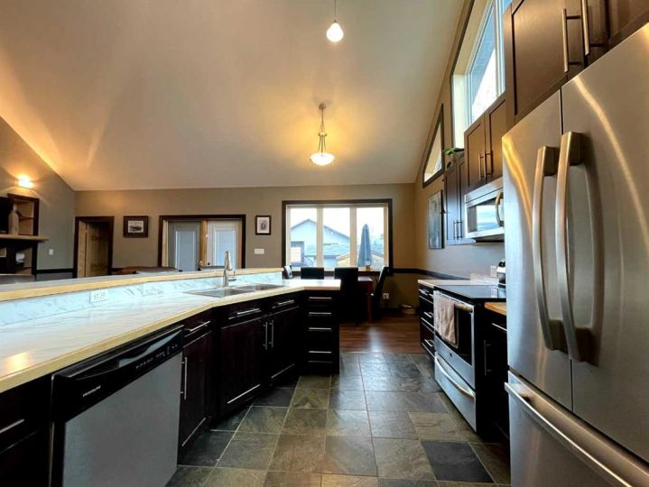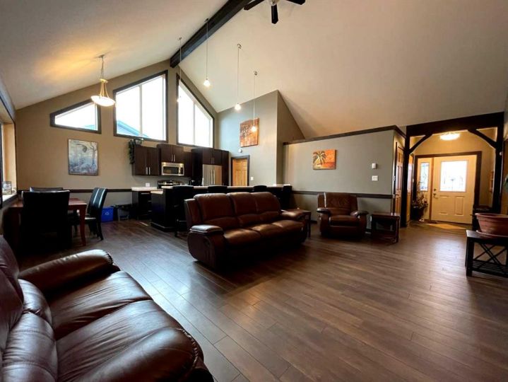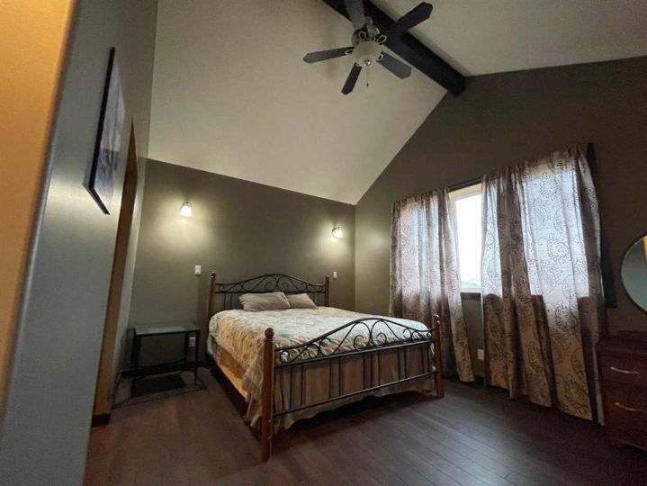 This home is an exquisite custom-built 2013 bungalow on a corner lot! There are extra high-end finishes throughout the home. You enter the home to beautiful slate & Bulgarian laminate floors and a stunning travertine insert, leading to the living room with custom eastern white pine beam vaulted ceilings and large windows giving you all the natural light your heart could desire. With the center of the home holding a combined kitchen & dining area as well as the living room it is the perfect place to entertain your guests. The master bedroom off the living room has a separate exit to the deck, vaulted ceilings, two walk-in closets, and a 5pc ensuite with dual sinks. On the other side of the home, there are two other ample-sized bedrooms and a 4pc bathroom. The main floor laundry is off the kitchen just before you enter your heated 20x25 garage. It is the perfect spot to keep your toys and the snow off of your vehicle in those winter months! Downstairs has a separate entry and holds an additional kitchen, dining area, family room, 3 bedrooms, a 3pc bathrooms, laundry room, and the mechanical equipment room. Parking is not an issue at all here! outside you will find a 2 car concrete pad, off-street parking on the front and side of the property, and RV parking on the side of the home! Add this one to your list it is a must-see with all the natural light and high ceilings it is one of a kind!! Home comes fully furnished just need to bring your clothing bag!