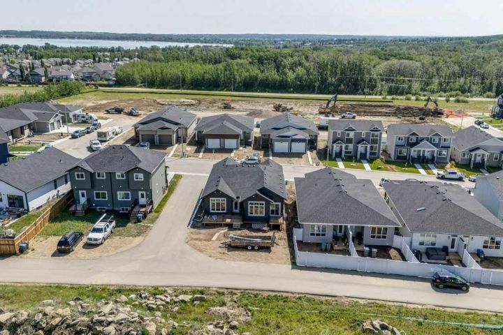 Immediate possession, this brand new bungalow floorplan by L&S Developments is perfect for a starter home or empty nester. Imagine having your morning coffee on the 20x8 covered front porch. Enter into good sized front foyer, with warm toned vinyl plank flooring leading to open floorplan. The vaulted ceilings and large windows make this home super bright and appealing. Metal spindle half wall for stairwell. Functional kitchen with white shaker cabinets, & feature navy centre island eating bar, quartz countertops, cabinet pantry, garbage/recycling pullouts, stainless steel appliances, chrome fixtures. Sliding door off of dining room to 7x8 back deck. Primary bedroom has room for king sized bed with black ceiling fan. Secondary bedroom is good sized for guests or office, carpet in both bedrooms. 4pce bathroom & handy main floor laundry. Basement is undeveloped but potential for family room, exercise area, bedroom and roughed in for another bathroom. Front sod and concrete sidewalk, backyard is black dirt leveled to grade. This home is located in Grayhawk on the north west side of Sylvan Lake. With easy access to highway and close proximity to the lake, golf course and all town amenities this up and coming subdivision is sure to meet all your needs. Future commercial and school sites as well as walking paths, parks playgrounds and pond. An abundance of wildlife to watch and a progressive new neighborhood to enjoy. GST included with rebate to builder. Taxes to be assessed.
