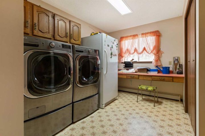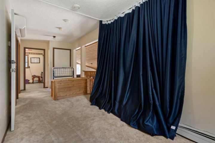 Inside the home, you’ll find a functional layout with main floor laundry, a generous living room complete with a cozy wood-burning fireplace, a separate dining area or office space, and a well appointed kitchen with ample cabinetry and counter space. The primary bedroom and a 4-piece bathroom are also conveniently located on the main level. Upstairs, a charming loft-style nook overlooks the living room that is perfect for reading or relaxing. Two additional bedrooms and another full 4 piece bathroom complete the upper floor. Additional features include an efficient inverter air conditioning unit, an attached heated garage with an exhaust fan and extractor hood, and plenty of space inside and out to make this property your own. The large shed is entirely supported by 6 foot bell bottom concrete columns.