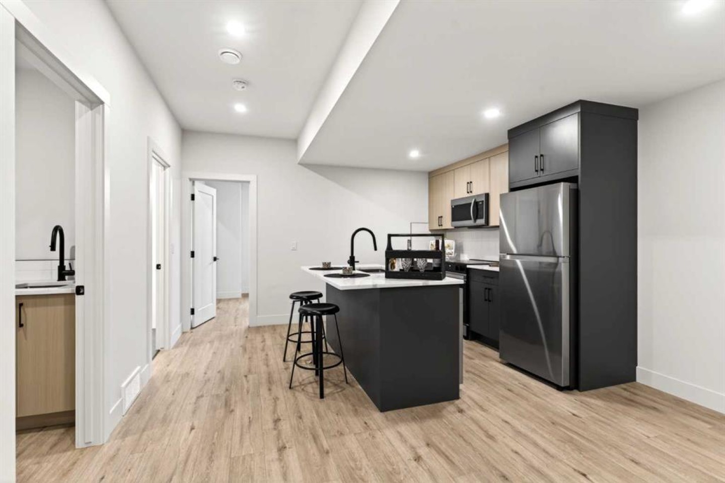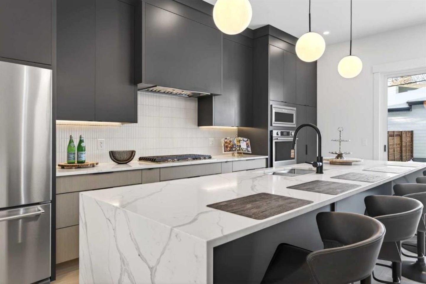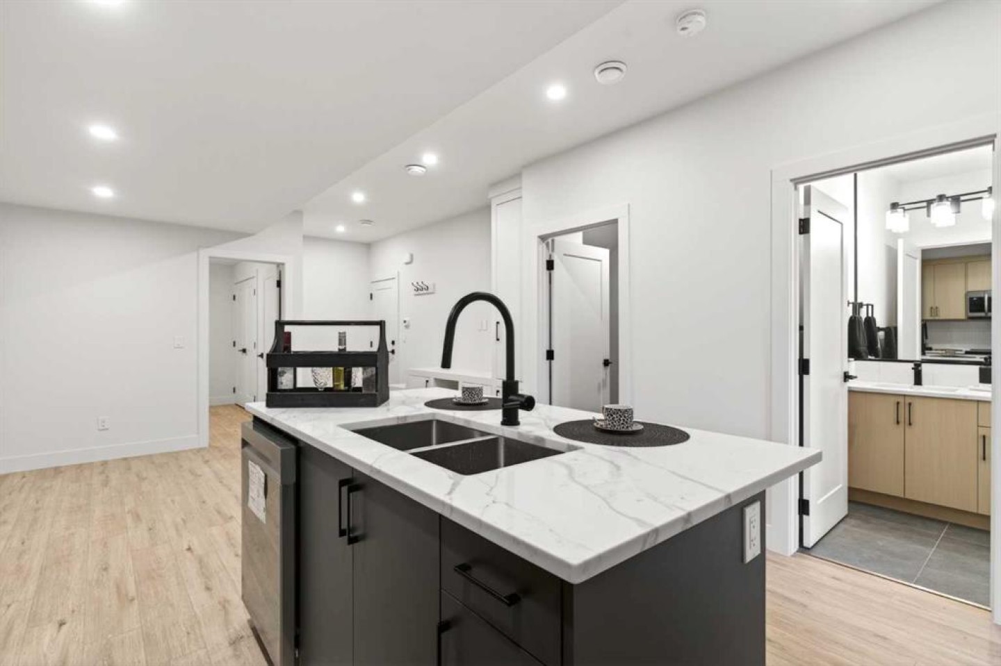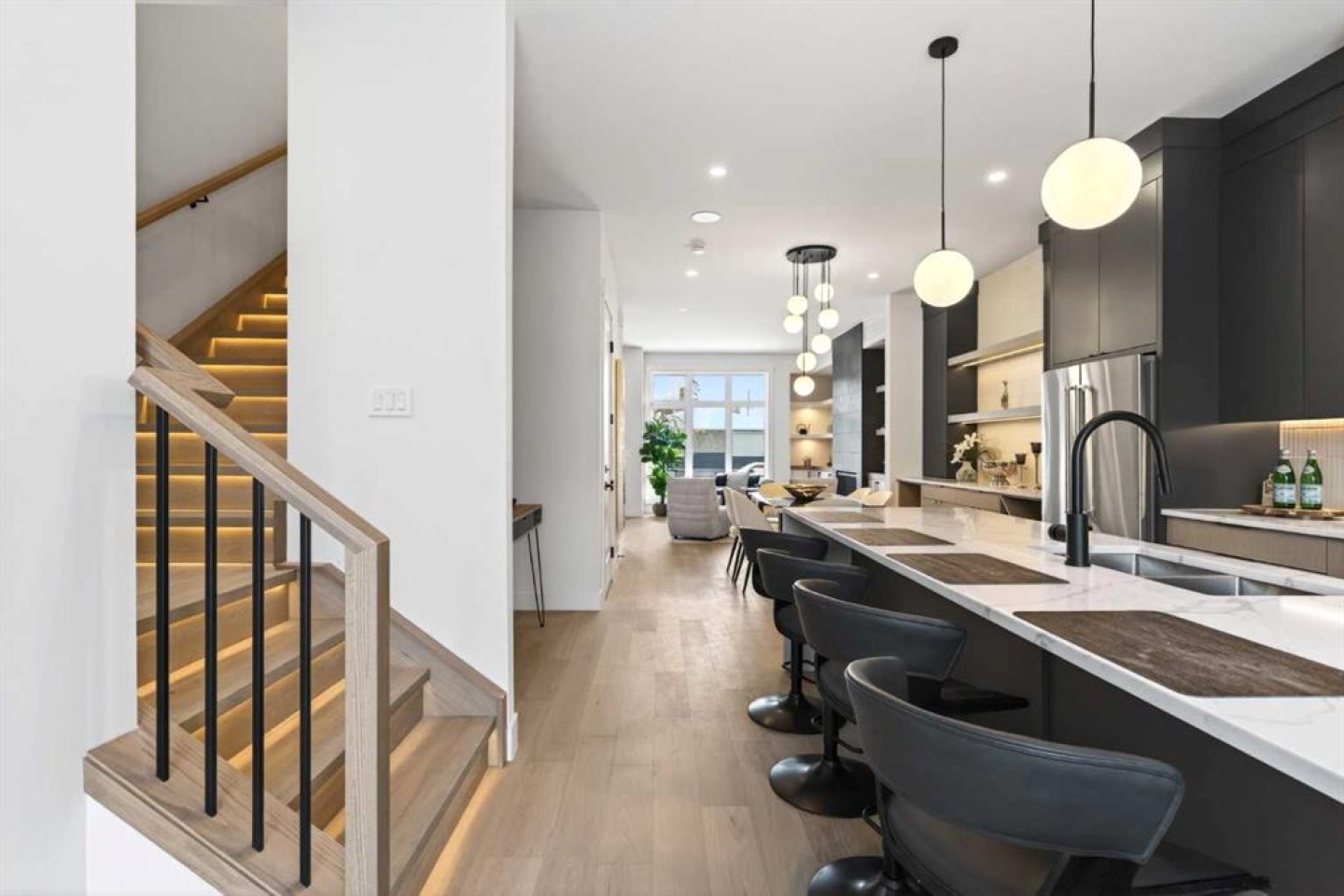 **Construction now Completed** Welcome to this brand-new, exquisitely designed luxury home located in the highly sought-after Killarney inner city area—an exceptional neighbourhood just minutes from downtown Calgary. This stunning residence offers superior finishes and thoughtful features that truly set it apart from the competition. Step into the unique main floor layout and be greeted by an inviting living room to your left, complete with a cozy fireplace and a discreet half bath. The centrally located dining area flows seamlessly into an adjacent built-in pantry and a spacious kitchen at the back, which overlooks a west-facing backyard with a raised deck — perfect for entertaining or relaxing outdoors. A practical mudroom with a walk-in closet completes the main level, providing ample storage and convenience. Upstairs, the large primary bedroom boasts a vaulted ceiling, private balcony, luxurious ensuite, and generous walk-in closet — a true retreat. Two additional secondary bedrooms feature elegant tray ceilings and walk-in closets, complemented by a well-placed upper laundry room for added ease. The fully finished basement offers a legal suite (pending full approval by the City of Calgary) with a central kitchen, two bedrooms positioned on opposite ends for privacy, and a shared living room area. The front bedroom includes a walk-in closet, sharing a modern four-piece bathroom. For ultimate comfort, the home is pre-wired with a rough-in for air conditioning and equipped with speakers on all levels. This home’s value lies in its exceptional style; stunning curb appeal, high-end finishes, and thoughtfully designed living spaces that elevate everyday living.. Don’t miss your chance to own this remarkable and stylish new construction home in the beloved Killarney community.