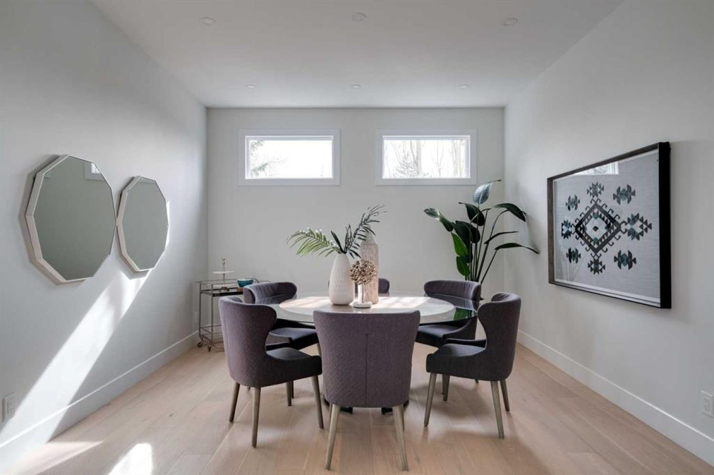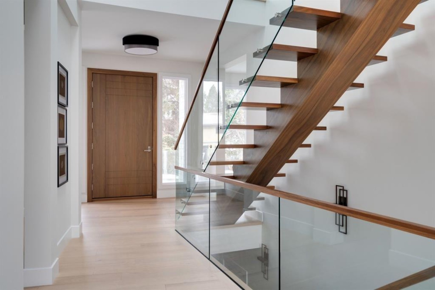 Built in 2020, this striking contemporary home offers 4,567 sq. ft. of thoughtfully designed living space, blending refined minimalist architecture with sophisticated modern finishes. Inspired by a relaxed, Californian sensibility, the home seamlessly balances everyday family living with stylish entertaining. Upon entry, a dramatic floating glass staircase makes an immediate architectural statement. The formal living room is both spacious and inviting, easily accommodating a grand piano while maintaining an intimate feel. The adjacent dining room is ideal for hosting large family gatherings or elegant dinner parties. At the rear of the home, a stunning wall of windows spans the family room, casual dining area, and sleek kitchen, flooding the space with natural light and creating a seamless sense of openness. A double-sided fireplace subtly defines the living zones while preserving a connected flow. The kitchen features a striking mix of high-gloss and warm wood cabinetry, a generous island designed for gathering, and a well-planned pantry offering excellent storage. Step directly from the kitchen onto a tiered deck and into the sunny, south-facing backyard, a private outdoor space ready for your personal vision. A versatile flex room off the kitchen is perfect for a home office, playroom, or cozy lounge. Upstairs, the expansive primary suite is a true retreat, complete with a luxurious ensuite, an impressive walk-in closet, and a that connects to an office or a room you can develop into a second closet. Three additional bedrooms, each with its own ensuite, provide exceptional comfort and privacy. The lower level includes a bright recreation room, a fifth bedroom, and a functional mudroom ideal for busy family life. Additional highlights include air conditioning, a heated driveway and an exceptional four-car garage. With generous proportions, contemporary design, and outstanding potential to personalize, this modern luxury home is ideally located in one of the city’s most sought-after neighbourhoods.