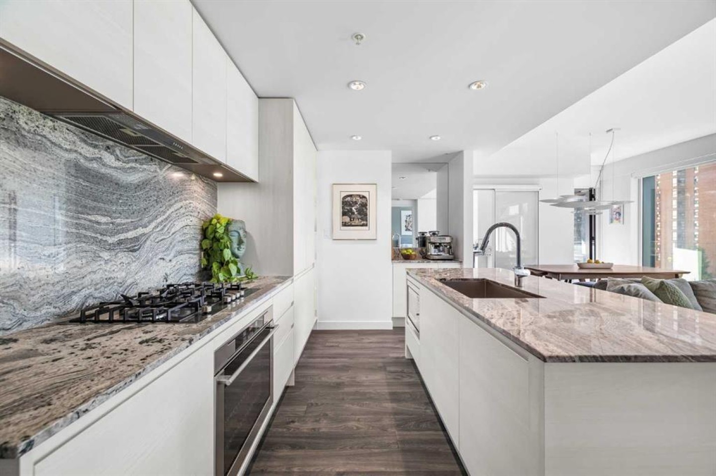 The kitchen is a true showpiece, thoughtfully designed with Italian Armony Cucine cabinetry, integrated German Liebherr double fridge/freezer, AEG gas cooktop and wall oven, and elegant granite countertops and backsplash. A large granite island anchors the space, ideal for both entertaining and everyday living. Sleek back-lit shelving and a custom end counter unit provide the perfect spot to showcase art or create a stylish dry bar. The entire unit has been tastefully upgraded, including designer lighting throughout, highlighted by an I Lucci Argentati linear suspension dining fixture valued over $10,000, along with fresh paint and wallpaper accents. Every room enjoys incredible views and an abundance of light. The primary suite offers a tranquil retreat with picturesque park views, a generous walkthrough closet, and a spa-inspired 3-piece ensuite with a large glass shower. The second bedroom, located on the opposite side of the unit in a desirable California style layout, provides excellent privacy. A separate den adds flexibility, perfect for a home office or study.