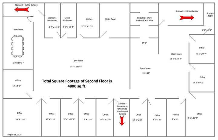 This affordable and professionally developed second-floor office offers 4,800 SF of versatile space in a highly visible location. The layout is designed to balance private offices and open-plan work areas, featuring a welcoming reception, a large boardroom, 12 private offices, six open cubicles, and two flexible open areas that can accommodate a shared workspace, co-working hub, training centre, classroom use, call centre, or support services. Additional features include a staff room with kitchenette, washrooms, and ample storage, making this space both functional and adaptable for a variety of business needs.