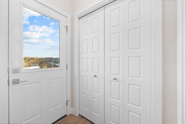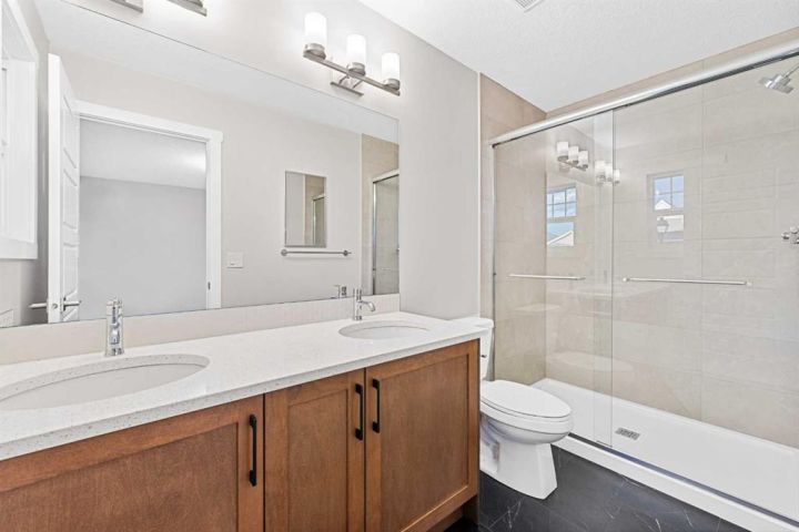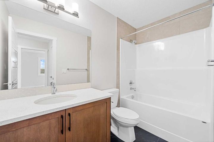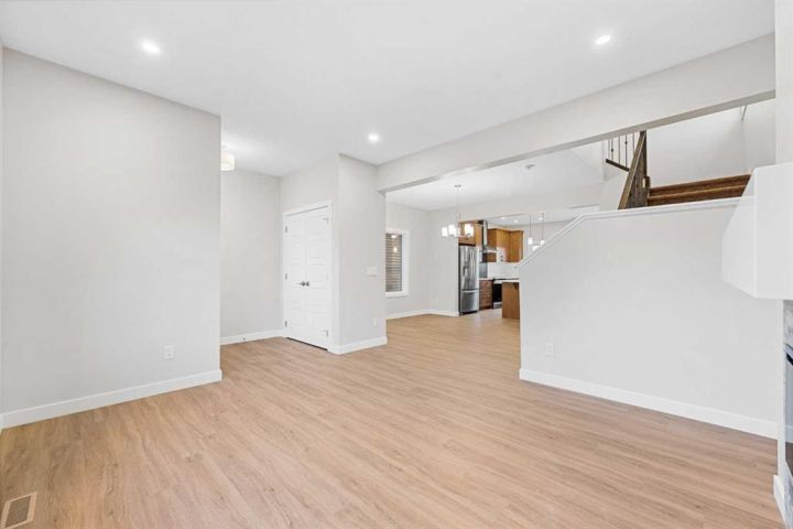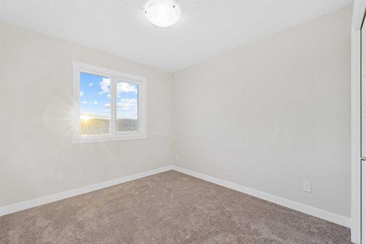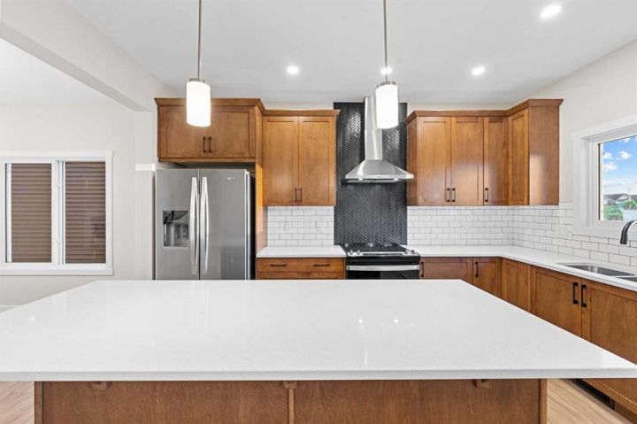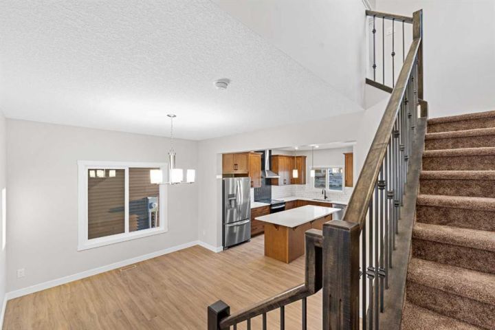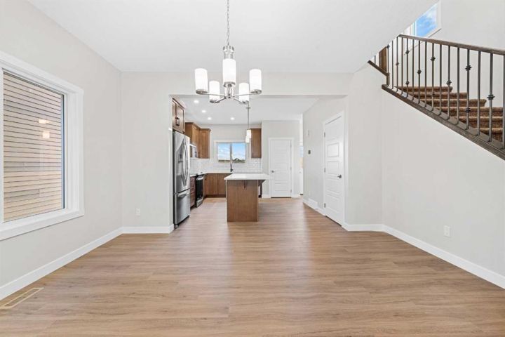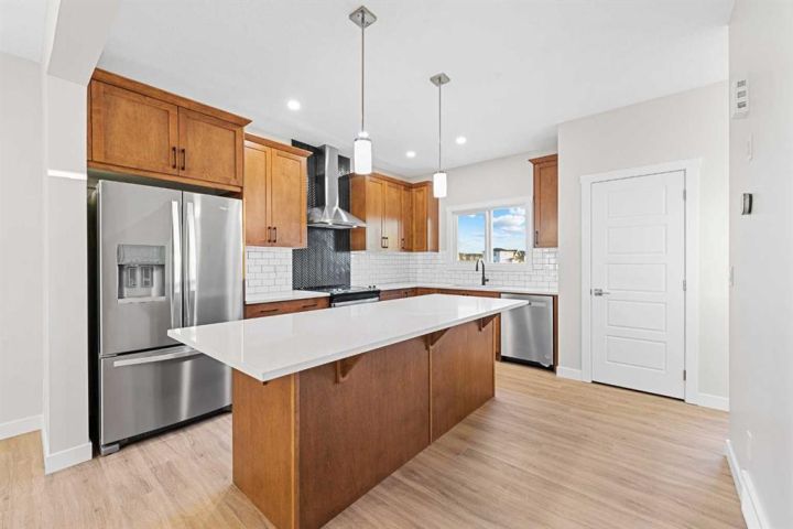 Move-In Ready | 2024 Build | East/West Facing | 1,580 SqFt | 3-Bedrooms | 2.5-Bathrooms | Incredible Living Space | Quartz Countertops | Stainless Steel Appliances | Beautiful Finishes | Open to Below Ceilings | Pot Lighting | Open Floor Plan | Electric Fireplace | Large Windows | Upper Level Laundry | Side Entry to Basement | Alley Access. Welcome to your stunning 2-storey home in Bayside with 3 bedrooms, 2.5 bathrooms and an expansive living space. The main and upper levels boast 1580 SqFt with an additional 701 SqFt in the unfinished basement. Open the front door to a foyer with views into the open concept main level. The front living room is framed with large windows beaming with morning sunlight through the East facing windows. The living room is paired with an electric fireplace adding both style and comfort to this space. The open floor plan compliments a smooth transition from living to dining. The kitchen is outfitted with ample cabinet storage, a bold and stylish black herringbone accent backsplash, quartz countertops, stainless steel appliances and a centre island with barstool seating. The kitchen is also includes a gas line to the stove! The kitchen has a pantry for dry goods storage too! Off the kitchen is a rear coat closet and back door that leads to the backyard and rear parking pad. The main level is complete with a 2pc bath. Upstairs holds 3 bedrooms and laundry. The primary bedroom is grand with a walk-in closet and a private 4pc ensuite bath with a walk-in shower and a double vanity. Bedrooms 2 & 3 are both a great size with closet storage and share the main 4pc bathroom with a tub/shower combo. The laundry is located on this upper level in a deep closet to not take away from any of your living space. Downstairs, the basement has a separate side entry and has rough-in plumbing! This space can be easily transformed to fit your family's needs. Outside is a great sized backyard with space for a deck and a rear detached double garage! Hurry and book your showing at this incredible family home today!