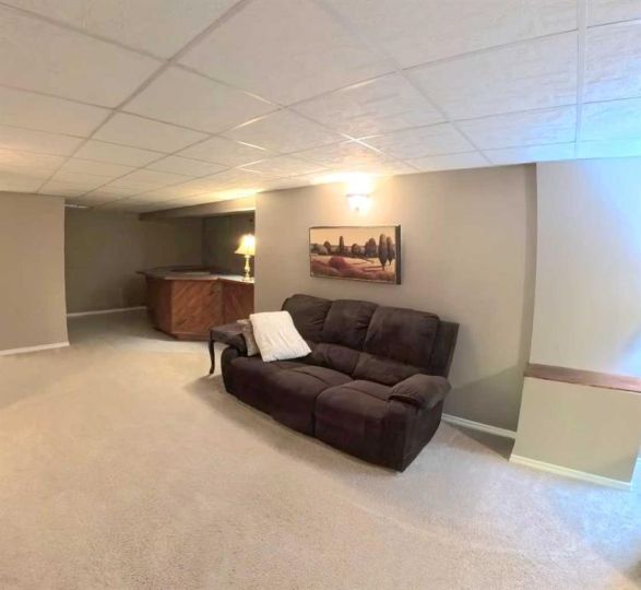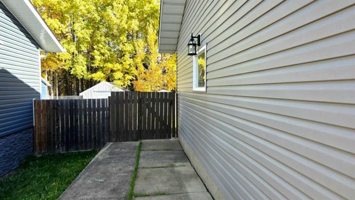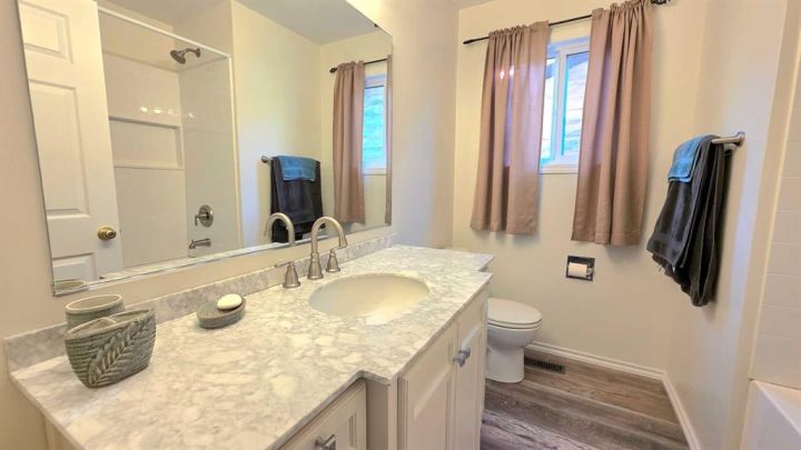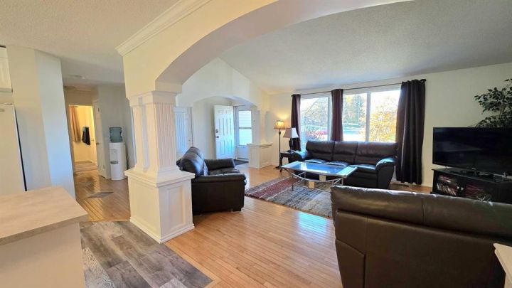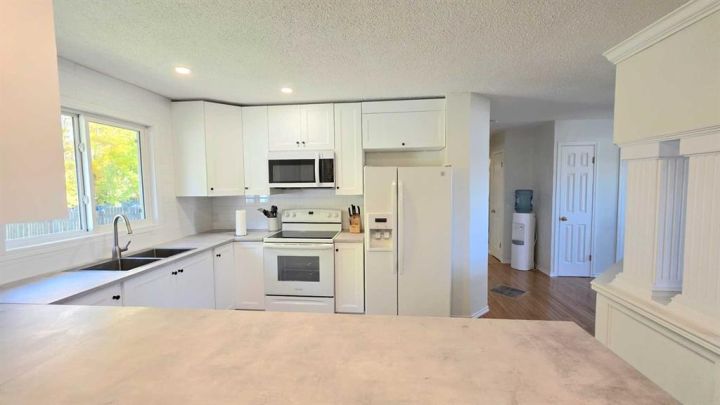 This beautifully renovated bungalow sits on a large, fully fenced lot that backs onto peaceful green space. Enjoy the brand-new back deck, long driveway, and attached single-car garage. Inside is bright and open with a new kitchen featuring tall white cabinets, vinyl flooring, and great counter space overlooking the backyard. Gorgeous hardwood floors flow through the living, dining, and bedroom areas. Three bedrooms on the main level, including a spacious primary with extra closets. The finished basement offers a large family room including a wet bar, laundry, and a 3-piece bath. Updates include windows (2013), siding (2013), shingles (2010), furnace and hot water tank (2013). Exceptionally clean and well maintained—furnishings included! Quick possession available.