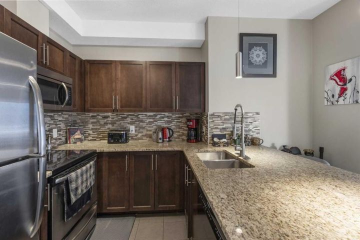 Welcome to East Lake Boulevard, this one-of-a-kind ground floor unit with a private entrance from the main building is a bright and spacious 2-bedroom+den main floor condo offering 871 sq ft of comfortable living. The open layout features 9' ceilings, a modern kitchen with granite countertops and plenty of cabinet space, adjoining a welcoming living area with floor to ceiling windows that brings in natural light, and step out onto your private WEST FACING patio, complete with its own separate entrance. The primary bedroom includes a 3-piece ensuite, and large closet, while the second bedroom is served by a full 4-piece bath. A generous den provides additional flexibility and includes convenient insuite installed bicycle racks, or plenty of room for a home office. Parking is a dream with a tandem double parking spot, with room for TWO vehicles. Enjoy the benefits of in-suite laundry, plus condo fees that cover heat, water, sewer, insurance, management, reserve fund contributions, snow and trash removal. Ideally located steps from Visitor parking, and right beside East Lake Park and Genesis Place Recreation Centre, giving very close access to walking, running pathways, biking trails, a local pond, tennis and pickleball courts, and an outdoor ice rink for the outdoor enthusiast. This family friendly AND pet friendly building with an excellent reputation combines comfort, convenience, and great amenities in one stunning package!