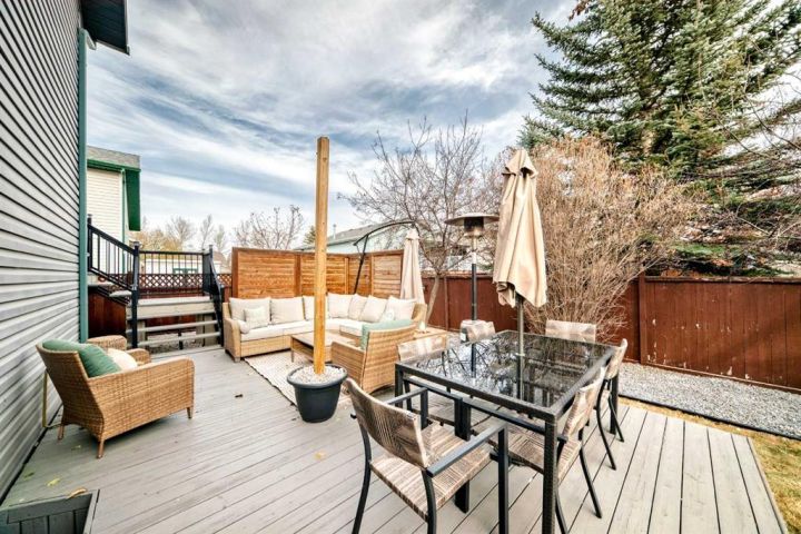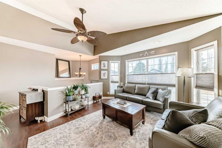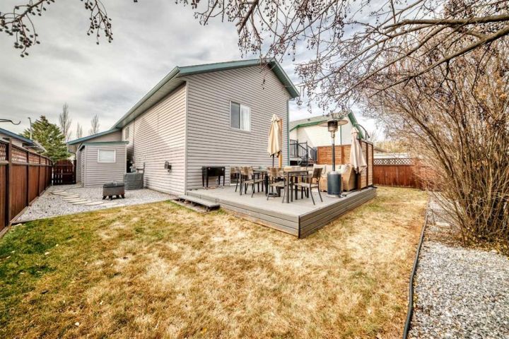 Welcome to this spacious and stylish fully developed bilevel home offering nearly 2,000 sq. ft. of comfortable living space in the highly desirable Sunridge community that is within walking distance to the tri-schools and where homes rarely come to market. Step inside to an inviting open-concept main floor featuring vaulted ceilings, high-grade laminate flooring, and a bright kitchen with skylight and generous eating area. The primary bedroom includes a walk-in closet and a convenient 2-piece ensuite, with an additional generous-sized bedroom completing the main level. The bright, open basement is perfect for relaxing or entertaining, offering a cozy family room and flex space with a gas fireplace, plus a large additional bedroom, full bathroom, and plenty of storage. Enjoy the beautifully landscaped yard, designed for privacy with mature trees and shrubs, along with upper and a lower private deck — ideal for outdoor gatherings. Additional highlights include a double attached garage (insulated and roughed-in for heat), solar panels for lower utility costs, and air conditioning to keep you cool in summer. With a newer furnace and hot water tank, this home has been updated top to bottom, inside and out — ready for you to move in and enjoy.