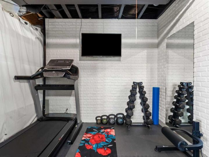 office cabinetry, floating shelves in office, pipe shelves in basement, mirror in gym, mirror in back hall, insulation and metal cladding for shop, speaker, shed