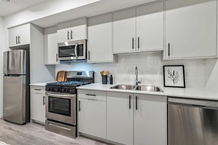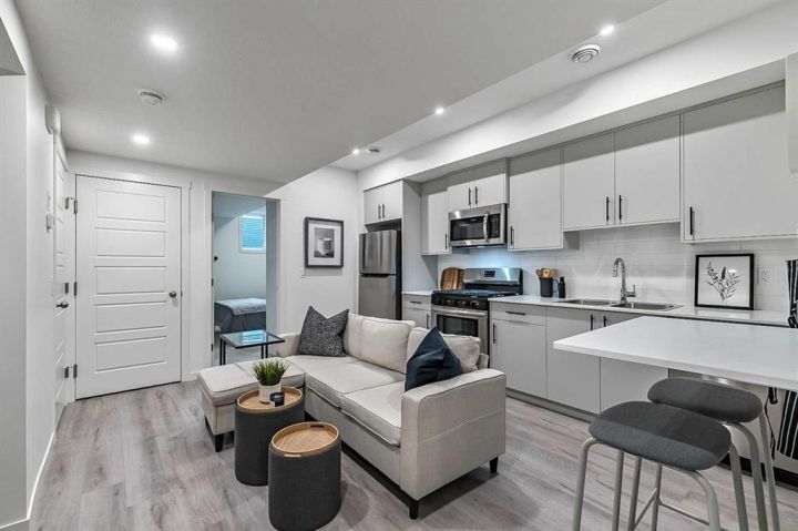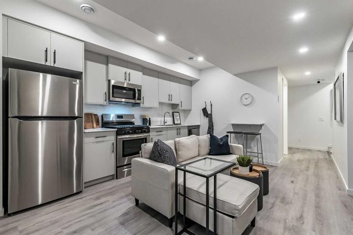 The legal basement suite offers an additional 445 sq. ft. of self-contained living space with a private side entrance, one bedroom, one bathroom, a kitchen with stainless steel appliances including a gas range, in-suite laundry, and separate mechanicals with dual furnaces and hot water tanks.