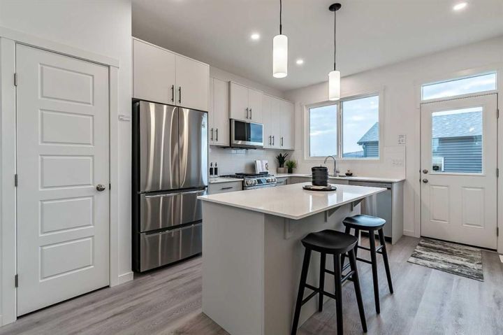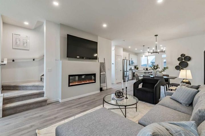This home features a stylish Prairie elevation and modern interior finishes throughout. The main floor offers 9’ ceilings, luxury vinyl plank flooring, and Decora-style switches, creating a bright and cohesive look. The open-concept layout includes a spacious great room with an electric fireplace, a dedicated dining area, and a rear kitchen complete with quartz countertops, a stainless steel sink, and a premium stainless steel appliance package with a gas range both in the main kitchen and the basement suite.