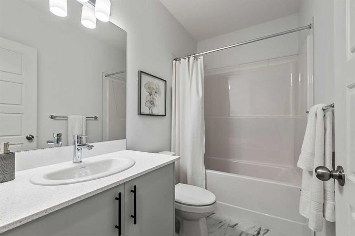 Upstairs, you’ll find three comfortable bedrooms including a well-appointed primary suite with ensuite, a 4-piece main bath, and convenient upper-level laundry. Plush carpeting with 8lb underlay and iron spindle railing add comfort and contemporary detail.
