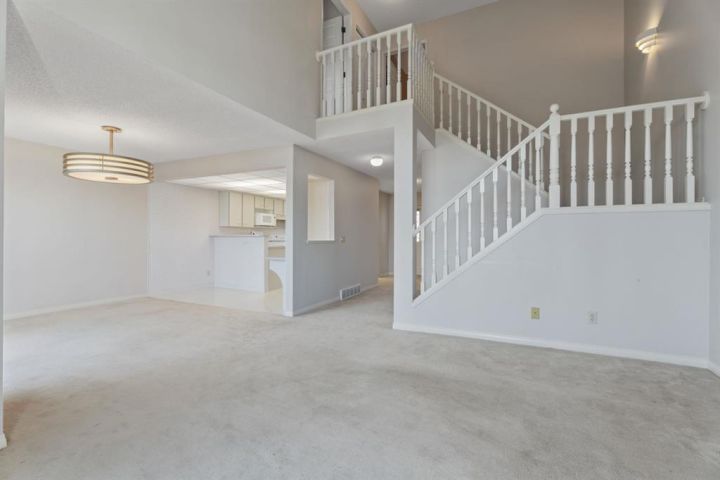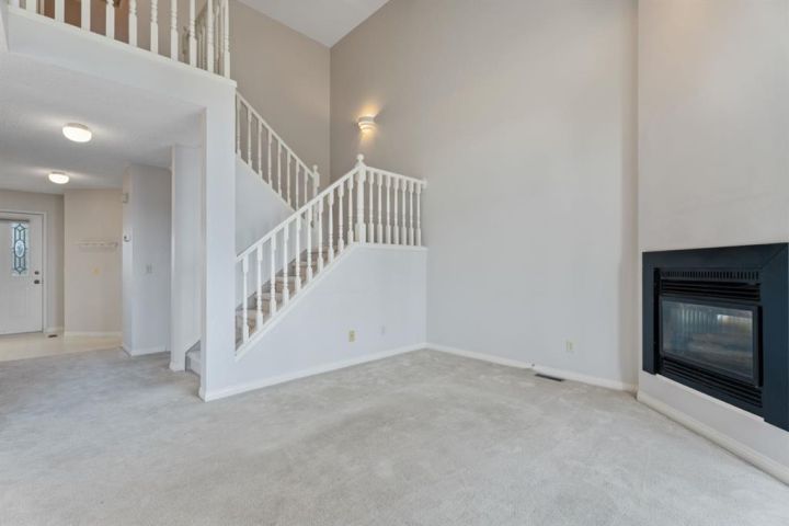 The main floor features a large kitchen with plenty of storage, opening to a spacious dining area and a large living room with a stunning vaulted ceiling that soars up to the second floor. A cozy gas fireplace and upgraded triple-paned windows on the main and upper levels fill the space with natural light while enhancing comfort and efficiency. Step onto your private balcony and enjoy the peaceful setting — this home backs directly onto a park and the community pathway system, providing privacy and a connection to the outdoors.