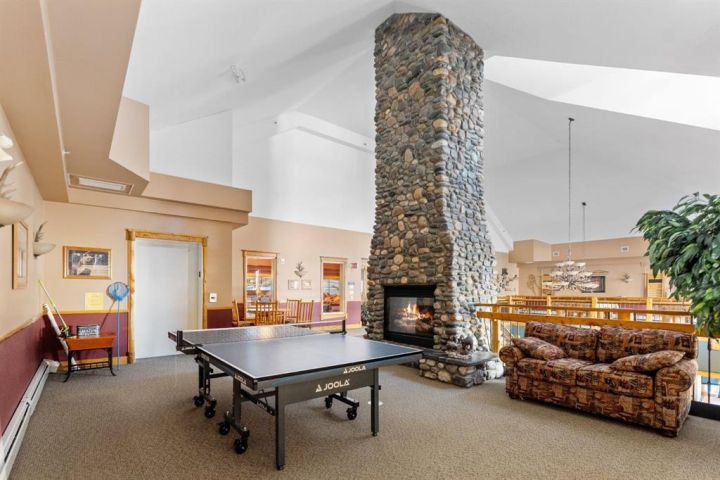 Natural light fills the open-concept living area through expansive windows, while the private balcony provides the perfect place to enjoy morning coffee or evening alpenglow over the peaks. The well-appointed kitchen and generous dining area create a warm gathering space for friends and family, complemented by a cozy living room anchored by a gas fireplace.