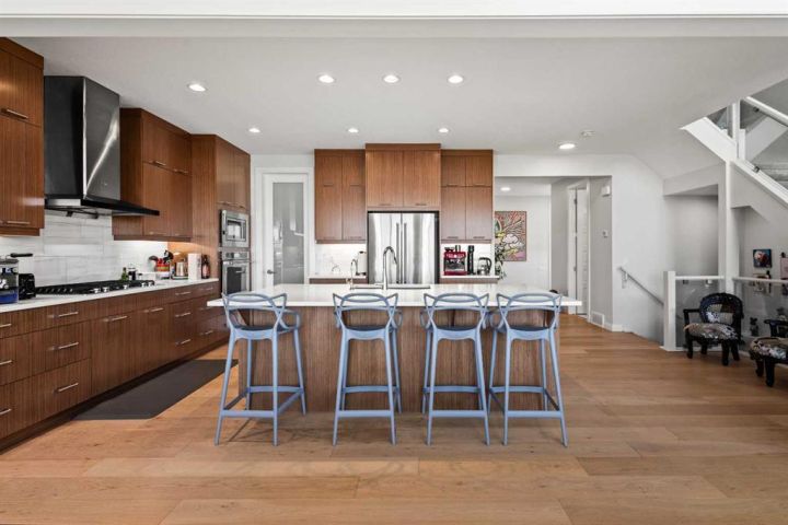 The gourmet kitchen showcases sleek cabinetry, premium appliances, and an oversized island designed for both function and entertaining. Flowing seamlessly into the dining and living areas, the main floor is an entertainer’s dream, bathed in natural light and framed by sweeping park views.