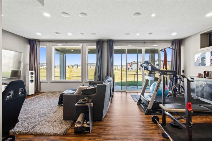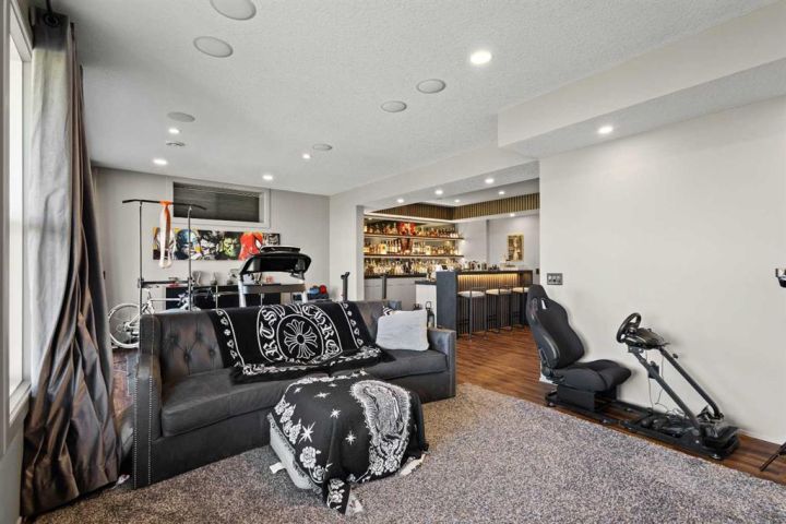 The professionally developed walkout basement is a showstopper – a $200,000+ investment featuring a custom full bar, a dedicated water bar, an indulgent sauna, in-floor heated bathroom, and multiple lounge zones designed for hosting or relaxing in style. This lower level transforms the home into a true private retreat.