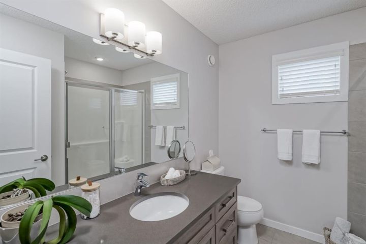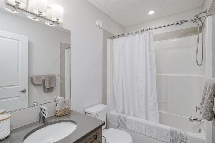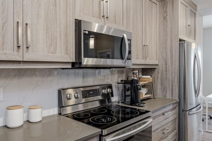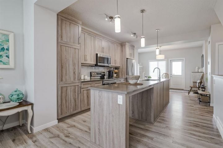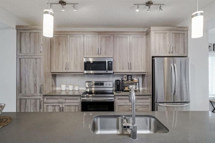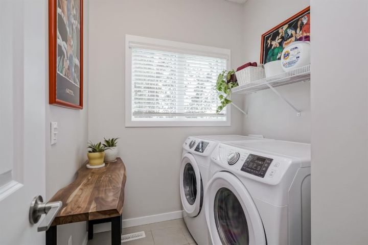 Designed for both comfort and style, the bright open-concept layout features 9-ft ceilings, triple-pane windows, and premium finishes throughout. The modern kitchen showcases quartz countertops, upgraded Samsung appliances, soft-close cabinetry, and a large island perfect for entertaining. You’ll also appreciate the ample-sized laundry room conveniently located on the main floor, adding to the home’s functionality and day-to-day ease. Step onto the oversized balcony with a gas BBQ line to relax or host outdoors.