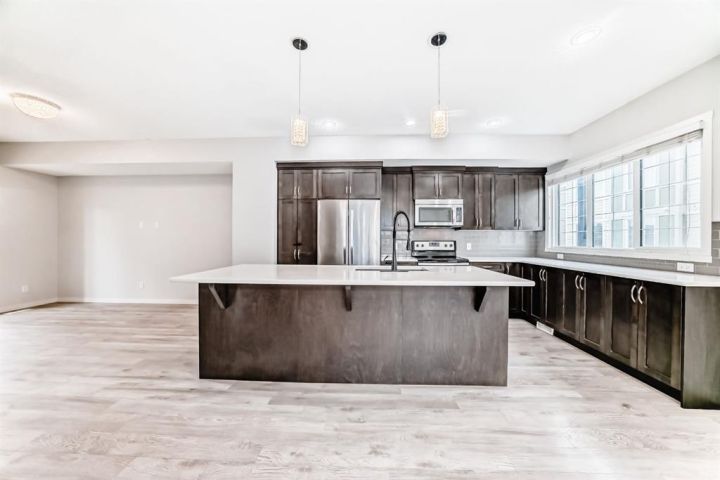Step inside to an inviting OPEN-CONCEPT main floor boasting 9-FT CEILINGS, contemporary laminate flooring, and abundant NATURAL LIGHT from TRIPLE-PANE WINDOWS. The chef-inspired kitchen is the centerpiece of the home, showcasing QUARTZ countertops, full-height SOFT-CLOSE cabinetry, a subway tile backsplash, and a massive center ISLAND with extra STORAGE. Complete with WHIRLPOOL STAINLESS STEEL appliances, this kitchen is ideal for both everyday cooking and entertaining.
