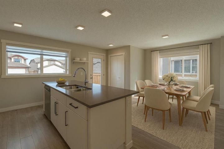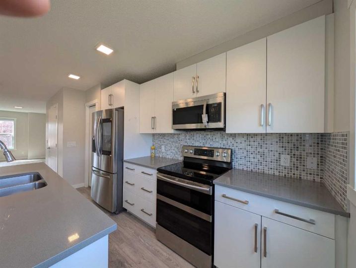 The main floor is perfect for a growing family, featuring a south-facing living room and an open-concept layout for the dining and kitchen areas. The kitchen is a true highlight with its modern design, including a large quartz island, a sleek backsplash, and white cabinets. A Samsung appliance package adds both style and convenience.
