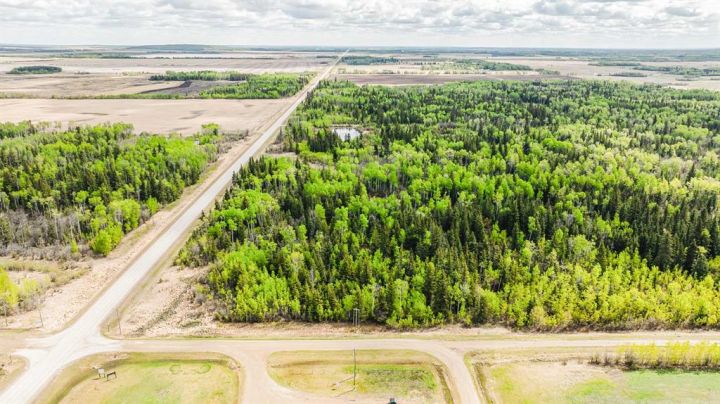 Mature timber throughout, including large stands of spruce, Large dugout for water, recreation, or livestock use, Highway frontage on paved Hwy 681—prime visibility and access, Bordering Savanna—walking distance to the school, fire hall, and ice rink. Zoned AG with potential for subdivision or rezoning (buyer due diligence).