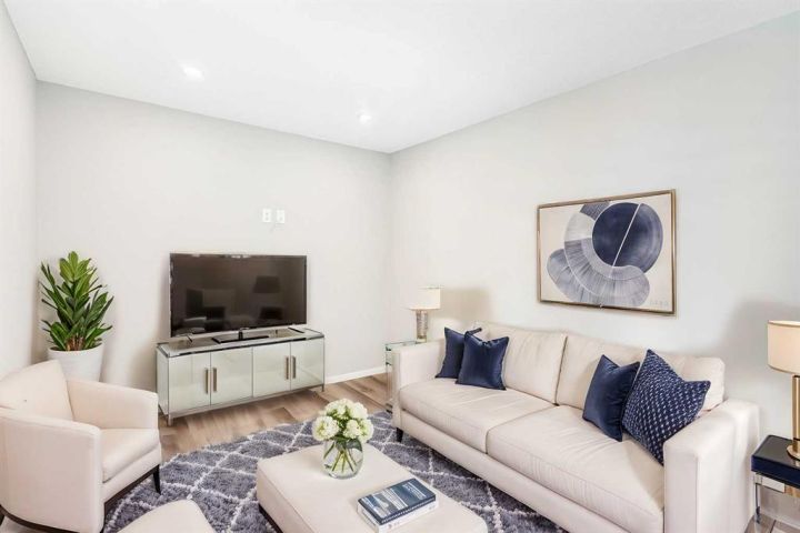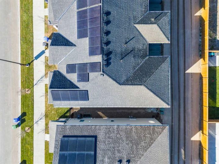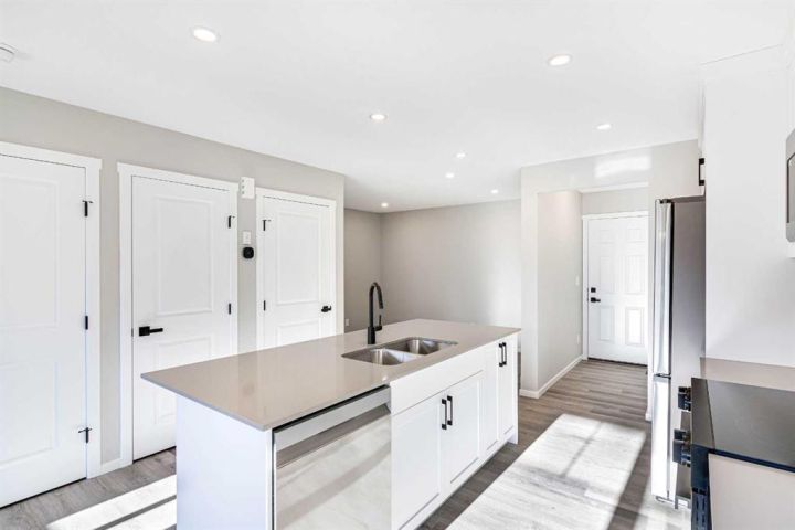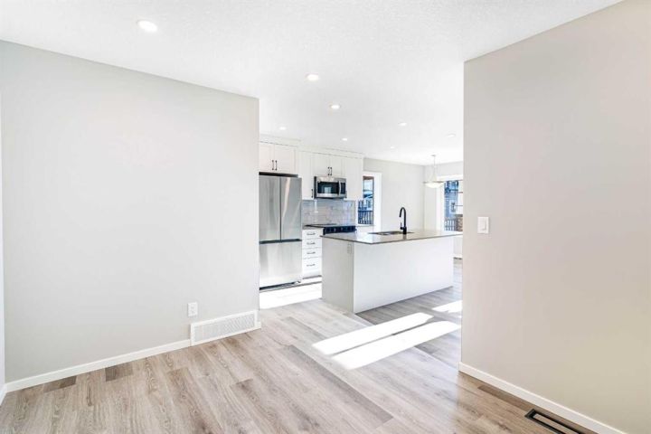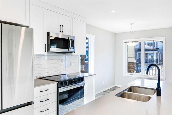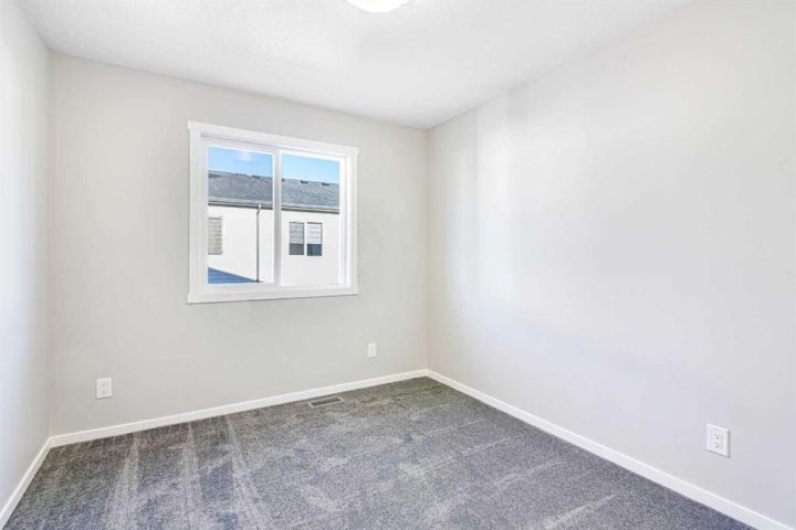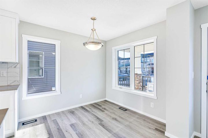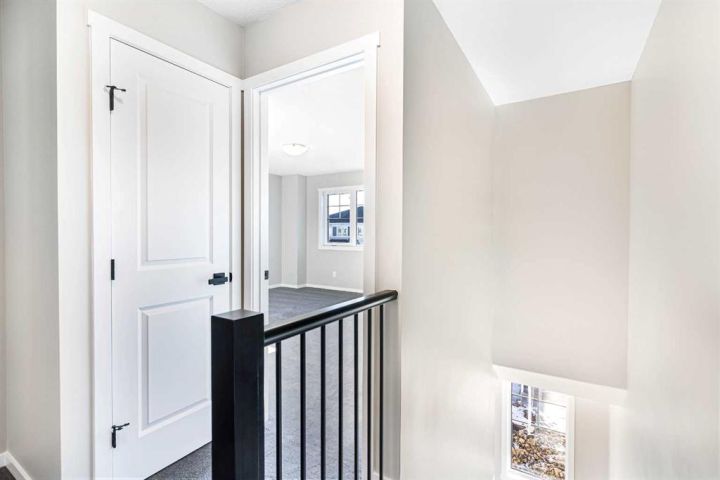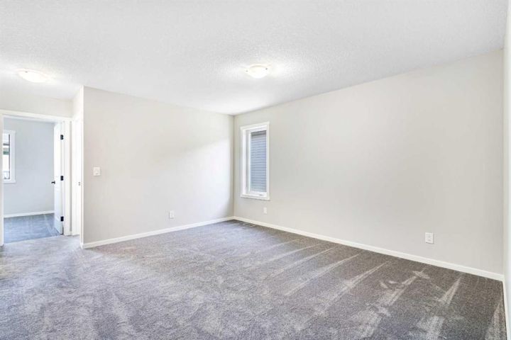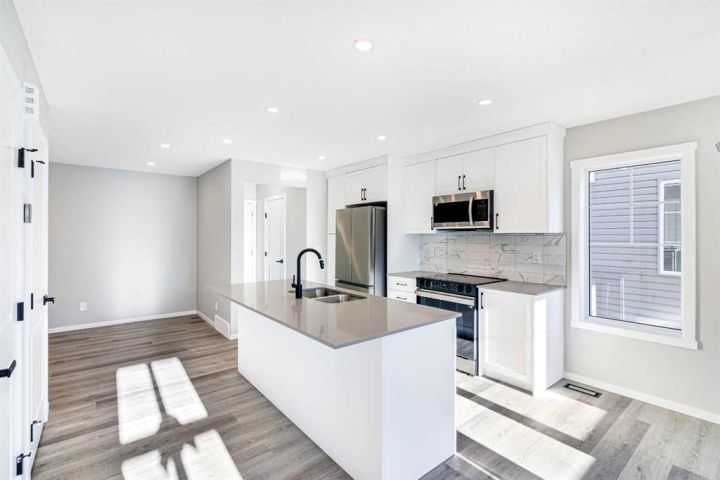 Welcome to this SOUTH FRONT FACING NO CONDO FEE END UNIT townhome! Font facing a large green space and a future school. Solar Panels on the roof. Impressive curb appeal and a modern design blends with a highly functional layout boasting 3 beds / 3 baths and over 1500 sq ft of finished living area. This home has also been highly upgraded throughout - raised kitchen cabinets with crown molding, stainless steel appliances, upgraded luxury vinyl plank, quartz countertops, tiled bathroom walls, as well as many additional pot light fixtures. Upon entry the open concept is exemplified with an inviting Kitchen/Dining/Living space on the main floor. The kitchen is equipped with upgraded stainless steel appliances, full height kitchen cabinets, and loads of counter space and storage! There is also a cozy living room, a large pantry closet, a 2 piece bath and double attached garage. Upstairs, the primary bedroom is bright and spacious and has a private 4 piece ensuite with a large walk-in shower. The bonus room provides more privacy for the primary bedroom from the other 2 bedrooms upstairs. There is also a full laundry room and 4 piece bath that completes the upstairs. The lower level is bright and has a 3 piece bathroom rough-in that is perfect for a future bathroom. With quick access to anywhere in Calgary via Stoney Trail and multiple nearby shopping options including Crossiron Mills, the quickly maturing community of Carrington is a great option for the busy family! Book your showing today!
