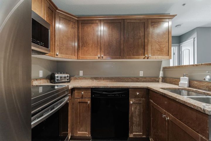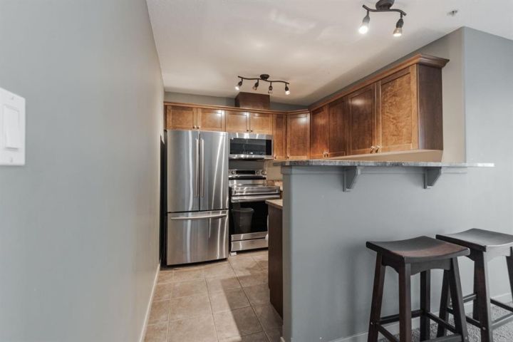Inside, the unit is bright and spacious with an open layout. The large living room centres around a cozy gas fireplace and offers access to a covered balcony with views of downtown and the greenery beyond. The kitchen is equipped with granite counters, stainless steel appliances, and an eat-up bar for casual meals, while the dining area provides space for sit down entertaining.