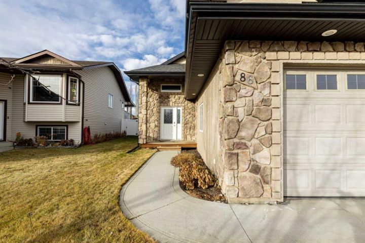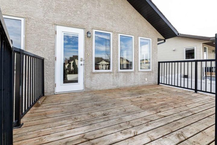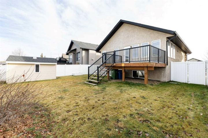 MOVE IN READY~ This MODIFIED Bi-LEVEL floor plan is functional and practical with 3 bedrooms and 3 bathrooms. A OVERSIZED front entrance with tile to the main floor with OPEN CONCEPT kitchen and living room. LOTS of natural light and extra high ceilings. REAL HARDWOOD floors on main floor and primary bedroom ABOVE THE GARAGE. FULLY finished basement with INFLOOR HEAT complete with tile and vinly flooring. DOUBLE heated garage with access to back yard which is vinyl fenced with a storage shed. From the dining room there is a garden door that leads to the back yard with 10x15 deck to enjoy family gathering. GREAT NEIGHBOURHOOD, FABULOUS LOCATION AND CLOSE TO schools, shopping, and Highway 2 only few minutes away.