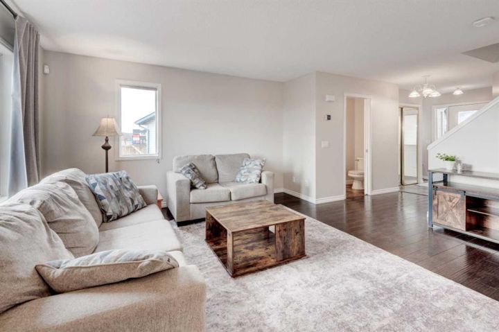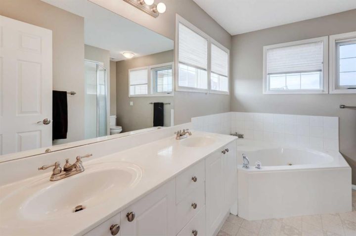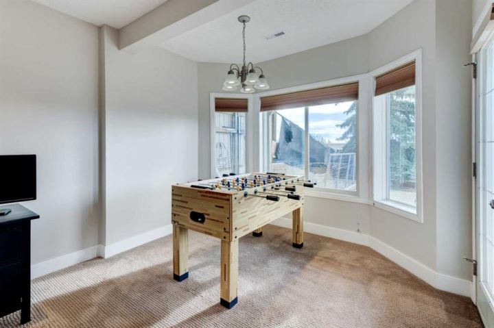 Welcome to 45 Cougarstone Place SW—an impeccably maintained, south-facing walk-out villa tucked into a quiet cul-de-sac in desirable Cougar Ridge. This rare semi-detached home with no condo fees offers 2,200 sq. ft. of total living space on a large pie-shaped lot with mountain views, combining elegance, privacy, and modern convenience. From the moment you arrive, pride of ownership shines through. Charming curb appeal, updated exterior finishes, and beautifully landscaped grounds set the stage for the bright, thoughtfully designed interior. The main floor features an inviting open-concept layout with fresh designer paint, upgraded electrical fixtures, and abundant natural light. The spacious living and dining areas flow into a generous kitchen equipped with brand-new matching stainless-steel appliances, ample cabinetry, and a functional breakfast bar. Step onto your 268 sq. ft. south-facing deck—ideal for morning coffee, afternoon barbecues, or taking in Calgary’s spectacular Rocky Mountain sunsets. Upstairs, discover three well-sized bedrooms and two full bathrooms, including a serene primary suite with a walk-in closet and a beautifully appointed ensuite offering dual sinks, a corner jetted tub, and a separate glass shower. A convenient laundry closet with extra shelving completes the upper level. The fully finished walk-out basement extends your living space with 9-foot ceilings, large windows, and a cozy media room featuring a 110-inch retractable projection screen. A built-in wet bar and half bath make this the perfect entertainment hub or movie-night retreat. A versatile additional room provides options for an office, hobby space, or storage, complementing the shelving in the furnace room. Walk out to a 283 sq. ft. private patio and a fenced backyard surrounded by mature trees and backed by a sound wall for exceptional privacy. Additional highlights include a new hot water tank, newer washer and dryer, extensive Cat5e and coaxial wiring to every room, and a double-attached insulated garage. The expansive pie-shaped lot offers space for gardening, pets, or play—an uncommon luxury in villa-style homes. Situated near top-rated schools and within walking distance to West District shops and amenities, WinSport/COP, Westside Recreation Centre, and with easy access to downtown or the mountains, this location truly has it all. Flexible possession available as early as December 22, 2025. Experience the best of Cougar Ridge living—modern upgrades, functional design, and the perfect blend of privacy and accessibility.