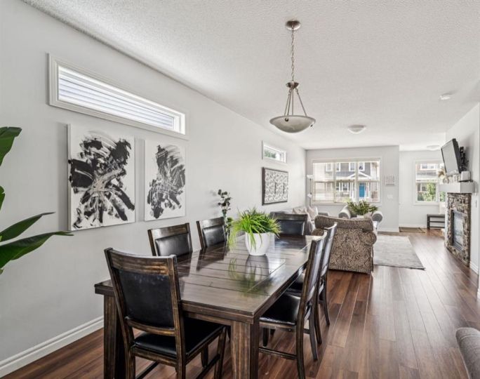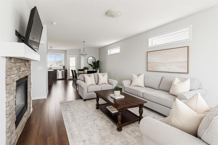 The main floor showcases an OPEN-CONCEPT design with HIGH CEILINGS, creating a bright and airy atmosphere. The stylish kitchen features QUARTZ COUNTERTOPS, a central ISLAND with BREAKFAST BAR, STAINLESS STEEL APPLIANCES, and rich DARK CABINETRY—a perfect setting for cooking, entertaining, or family gatherings. The dining area flows effortlessly into the living room, where a GAS FIREPLACE with STONE SURROUND and MANTLE serves as a warm and inviting focal point.