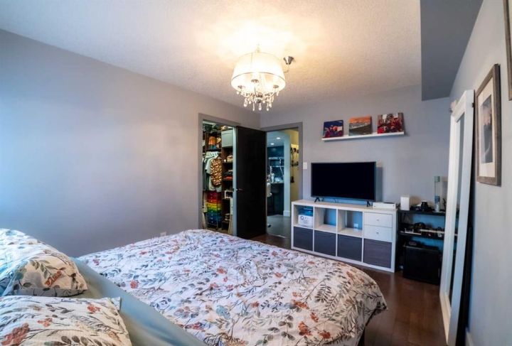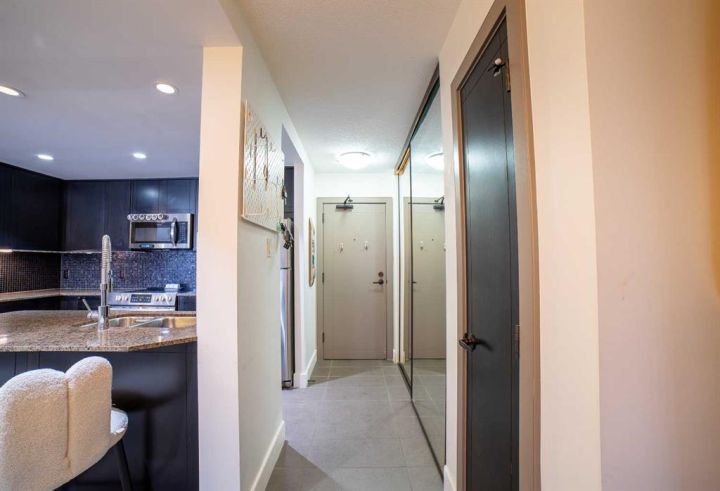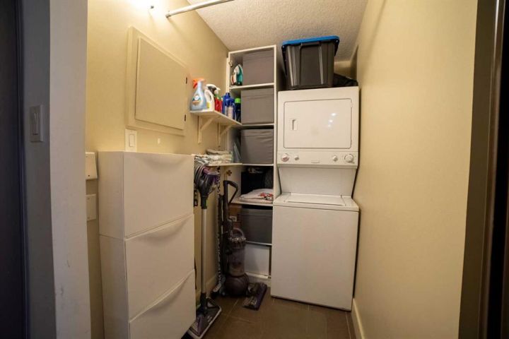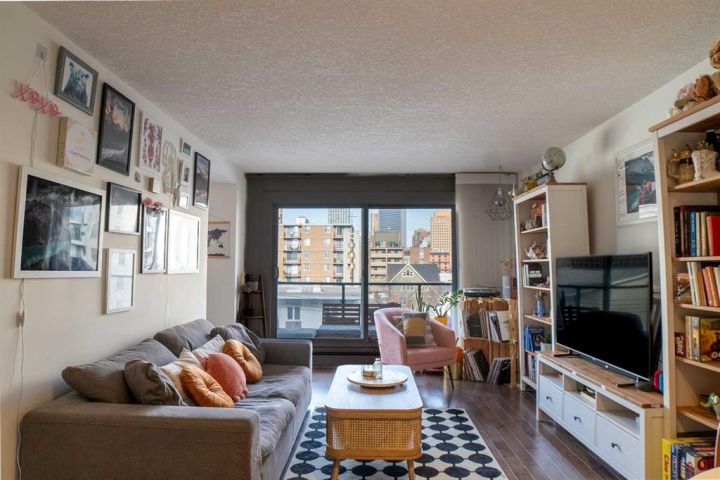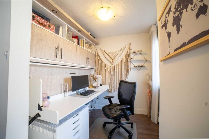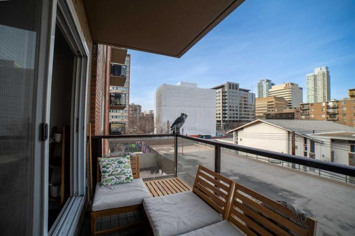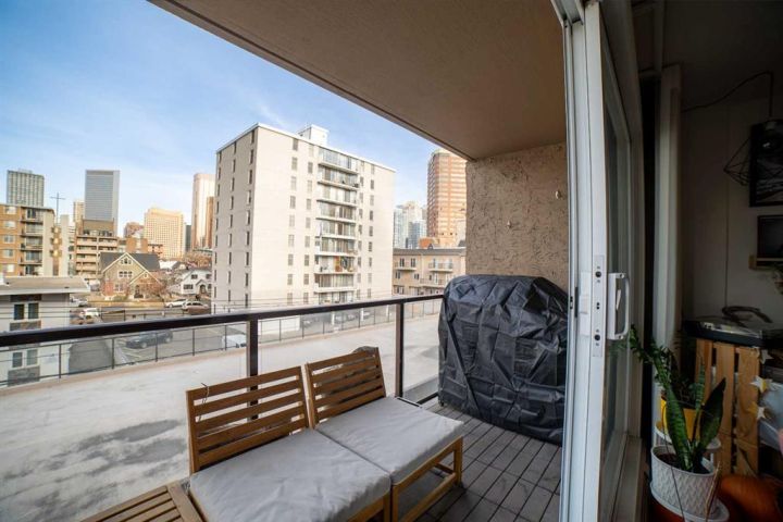 Welcome to your fabulous home in the eightwelve! A rare opportunity to live in the heart of the beltline and just steps away from the vibrant downtown. Exceptional 1 bd. + den unit with a full 4-piece bath and features an open style concept. Enjoy choice views across the city skyline from your north balcony off your spacious living room. The balcony has tile covering for a warmer, more comfortable experience. Fire up the barbecue and relax here for an early morning cup of java or an evening tall cool one, and take in the views. Step inside and feel right at home with the warm and cozy feel of the design. The kitchen features tasteful tile flooring, custom rich dark cabinetry, granite countertops, stylish backsplash, stainless steel appliances, and a raised breakfast bar. Ideal center point in your new home, as the kitchen is perfect to entertain in from as it overlooks the dining area and large living area. The living room is spacious, bright, and easy to work with to accommodate your tastes in furniture. The den located off your living room has a window and comes with a built-in Murphy bed. Yes, you can have guests over whenever you desire; no heavy sofa bed required! No need to clear off your desk either. The sleek design allows the computer to fold in when the bed choice is made! Great addition to this unit! Lots of cupboards and storage here. The primary bedroom is oversized and quite stylish, with plenty of room to relax. There is a large walk-in closet equipped with a large built-in chest of drawers. Did I mention the flooring? Hardwood throughout the primary bedroom, living room, dining room, and den areas. The rest is a more contemporary neutral sleek tile. The 4-piece bath has the same stylish tile on the floor and in the shower. The tub is an oversized soaker style tub - perfect to soak in after a long day! Walk into a dream laundry area by the entry and enjoy the extra space for storage next to the washer/dryer. Some added features the unit has include larger windows, under-cabinet lighting in the kitchen, push-to-open cupboards, and custom Hunter Douglas blinds. The blinds in the living room are remote-controlled! The home comes with a titled parking stall and a titled storage locker. The parking space is nestled nicely between two parking posts for added vehicle security. The building offers a full gym equipped with a jukebox for a little added entertainment, a washroom located beside the gym, and a 3rd-floor common patio area. Head up to the rooftop patio and experience something so unique you will be completely amazed. At night, you can stargaze or watch the fireworks during the Stampede here. There are lounge chairs to chill in and captivating views from the whole rooftop area! Truly an amazing bonus to living in this building. Units in the eightwelve do not come up very often, so don't let this opportunity to own this fabulous unit slip by. Steps from unique boutiques, grocery stores, parks, you name it. Concrete construction & pet friendly building