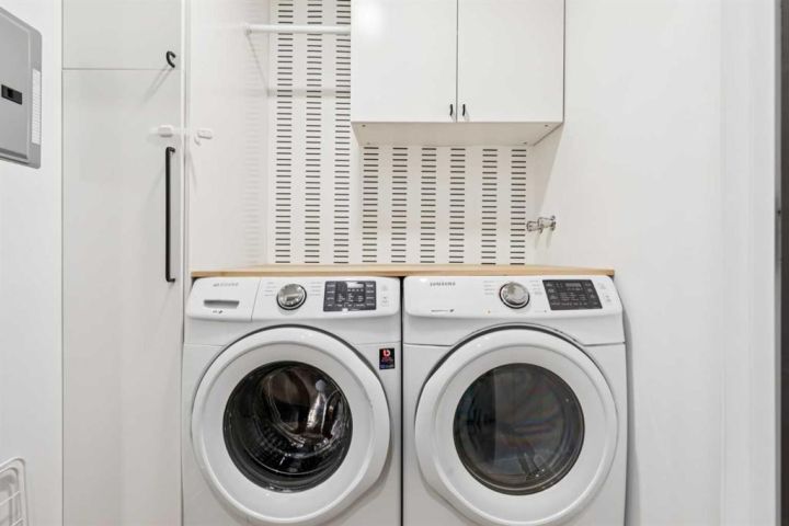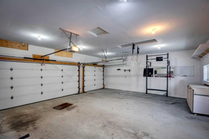 storage unit in main living room., TV in living room, alarm system. Suite appliances: gas stove, 2nd refrigerator, 2nd dishwasher, 2nd range hood, 2nd microwave, 2nd washer, 2nd dryer., TV in lower living room. Garage heater and storage shelving.