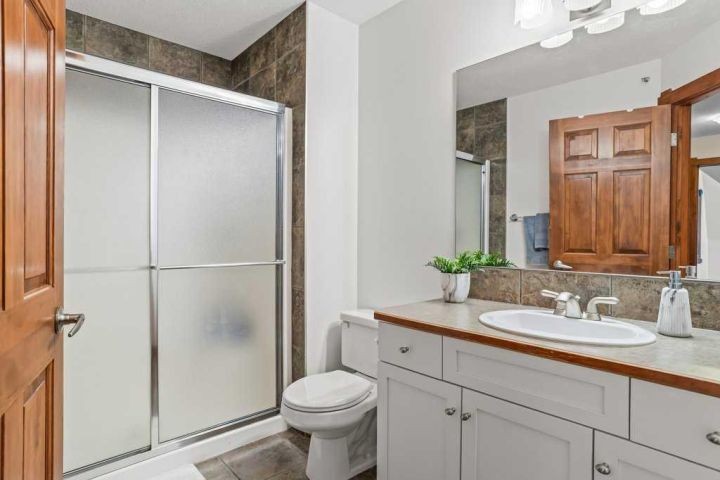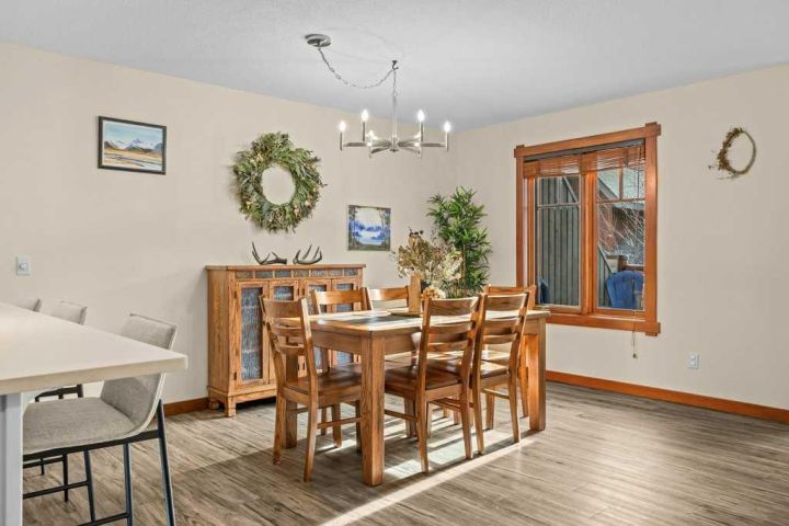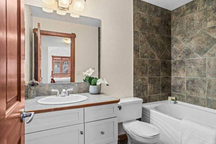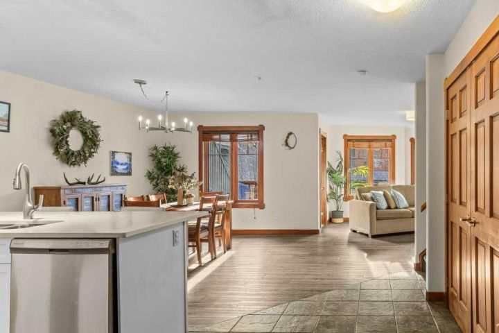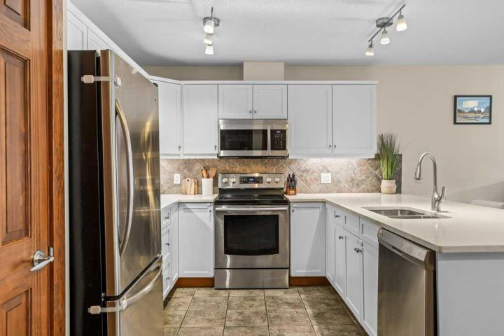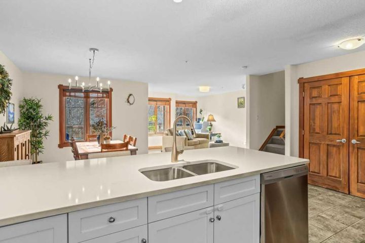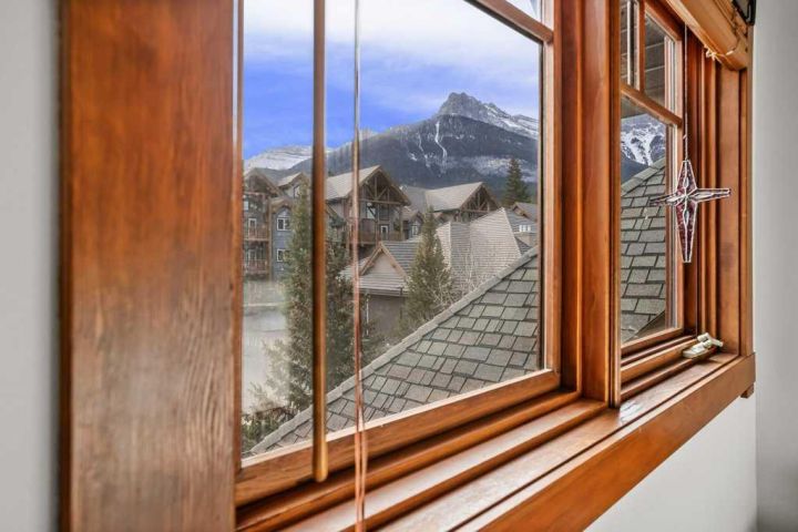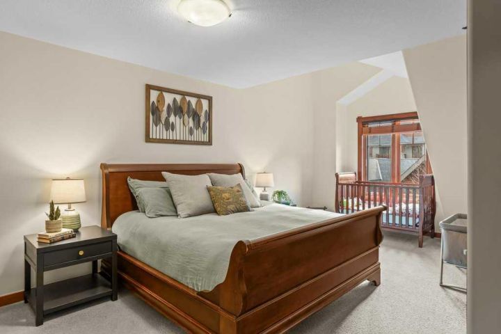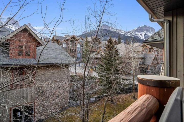 Direct views of the iconic Three Sisters mountains from every SW facing window from this top floor penthouse! Enjoy the expansive 1,348 sq.ft. living space spread across multiple levels, providing privacy and comfort for families or entertaining guests. The large kitchen / dining / living area is larger than most apartment or townhouse style properties in Canmore at the affordable end of the market creating a great place to relax and enjoy your time with others. There have been thoughtful and bright upgrades to the flooring, quartz kitchen counter top, and cabinets throughout giving it a warm mountain feel with a modern touch. The 2 large bedrooms upstairs have attractive ceiling lines, solid wood doors throughout and versatile layouts that allow for extra furniture like a sofa, work station, kids play area etc… A popular feature are the 2 titled parking stalls that come with the unit and a storage locker located at the end of the indoor parking stall. Crossbow has one of the best clubhouses in any building in Canmore with features you will not find elsewhere including: 2 hot tubs (one indoor and one outdoor), dry sauna, a sizable and well equipped gym, 2 pool tables, a ping pong table and lounge area / library. The Three Sisters area is a gateway to endless activities, including direct access to an extensive network of forest trails, from leisurely strolls along the Bow River Pathway to challenging scrambles up Ha Ling Peak. Explore the Three Sisters Pathway, enjoy kayaking or paddle boarding on Quarry Lake, disc golf, or cross-country skiing at the Canmore Nordic Centre. Crossbow is ideally located just a few steps away from the Bow River where you can catch the evening sun setting over Rundle Mountain or try your hand at fishing just out your door. The Three Sisters community is growing, with future plans for retail, office, and restaurant spaces at "The Gateway," including an IGA grocery store. Canmore's charming downtown is just a short drive or bike ride away.