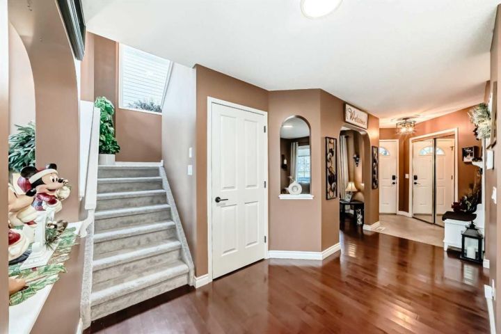 Welcome to this spacious & elegant home in the sought-after community of Hidden Valley. Schools, parks and walking paths make this a family friendly neighborhood, yet it has quick & convenient access to Stony Trail, leading to 'everywhere' you need to go! Over the past few years, this home has undergone extensive renovations including all new kitchen (quartz counters with gleaming white cabinets), new hardware, baseboard and trim, new microwave/hood fan & dishwasher, new carpet upstairs, new light fixtures, brand new, motorized zebra blinds in Living Room and Bonus Room/Office (over $3,000 value for blinds); as well as brand new shingles. The main floor includes a front of the house den/sitting room/dining room, which then leads to the open concept kitchen, dining room & living room. This 'heart of the home' area boasts the large & bright kitchen with island which is accentuated by soaring vaulted ceilings, floor to ceiling windows flooding this area of the home with natural light, gas fireplace for cold winter nights, and deck leading to large back yard where you'll enjoy summer BBQs. Laundry & powder room complete the main floor. Upstairs you will find the large primary bedroom with walk-in closet and 4 piece ensuite. Another hilite of this home is the upstairs bonus room, perfect for office space, home-work room or hang out space. Two more bedrooms & a 4-piece bathroom complete the upper floor. Downstairs contains a HUGE open family room, which can be partitioned for various uses, a 4th room which can be used for office/craft room (or enlarge the window for a 4th bedroom). Double detached garage and spacious back yard make this the ideal family home in a wonderful community. Book your private viewing today!