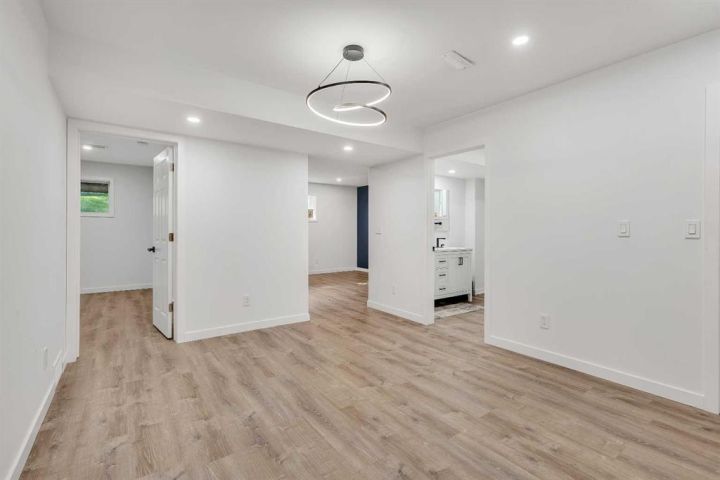 Discover this exceptional 5-bedroom, fully finished bi-level offering over 2,600 sq. ft. of beautifully designed living space in the heart of Hidden Valley. Ideally situated near schools, transit, parks, and everyday amenities, this home is perfectly tailored for family living. Step inside to a bright and spacious floor plan featuring vaulted ceilings, large windows, and hardwood flooring throughout the main level. The formal living and dining rooms are enhanced by elegant wrought-iron railings, creating an open and upscale feel. The updated kitchen features rich wood cabinetry, stainless steel appliances, and a massive centre island—perfect for cooking, entertaining, and everyday family living. Just off the kitchen is a cozy breakfast nook and a warm, inviting family room with a corner gas fireplace. Patio doors lead to the rear deck and a fully fenced backyard, offering an ideal space for kids, pets, and outdoor gatherings. The unique lofted primary retreat provides exceptional privacy with a walk-in closet and a full ensuite. Two additional bedrooms and a second full bathroom complete the main level. The professionally finished lower level (with permits) offers incredible versatility, featuring a large recreation area with a wet bar, two additional generous bedrooms, a full bathroom, and a separate laundry room. With its layout, the lower level offers excellent potential for a secondary suite or in-law setup (subject to City approval).