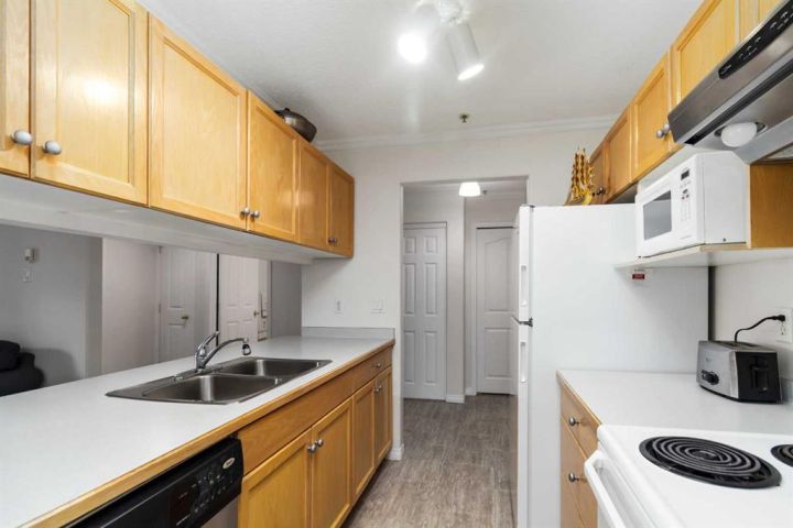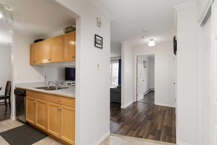 Unit 220 at 100 Richard, a bright and clean 1-bedroom apartment in the highly desirable Carrington Promenade. This unit is truly a gem, featuring laminate flooring, crown molding, and matching baseboards, all contributing to a light and bright atmosphere.