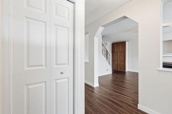 Step inside to a warm and thoughtfully designed main floor featuring new flooring up and down, bright West-facing windows, and a cozy gas fireplace that anchors the living space. The kitchen offers timeless white cabinetry, upgraded stainless steel appliances, a stylish backsplash, and a versatile moveable island with power—perfect for meal prep or extra seating. A built-in desk area with added cabinetry complements the adjoining dining space, which opens onto a spacious covered East-facing deck complete with outdoor roller shades—great for morning coffee or evening shade.