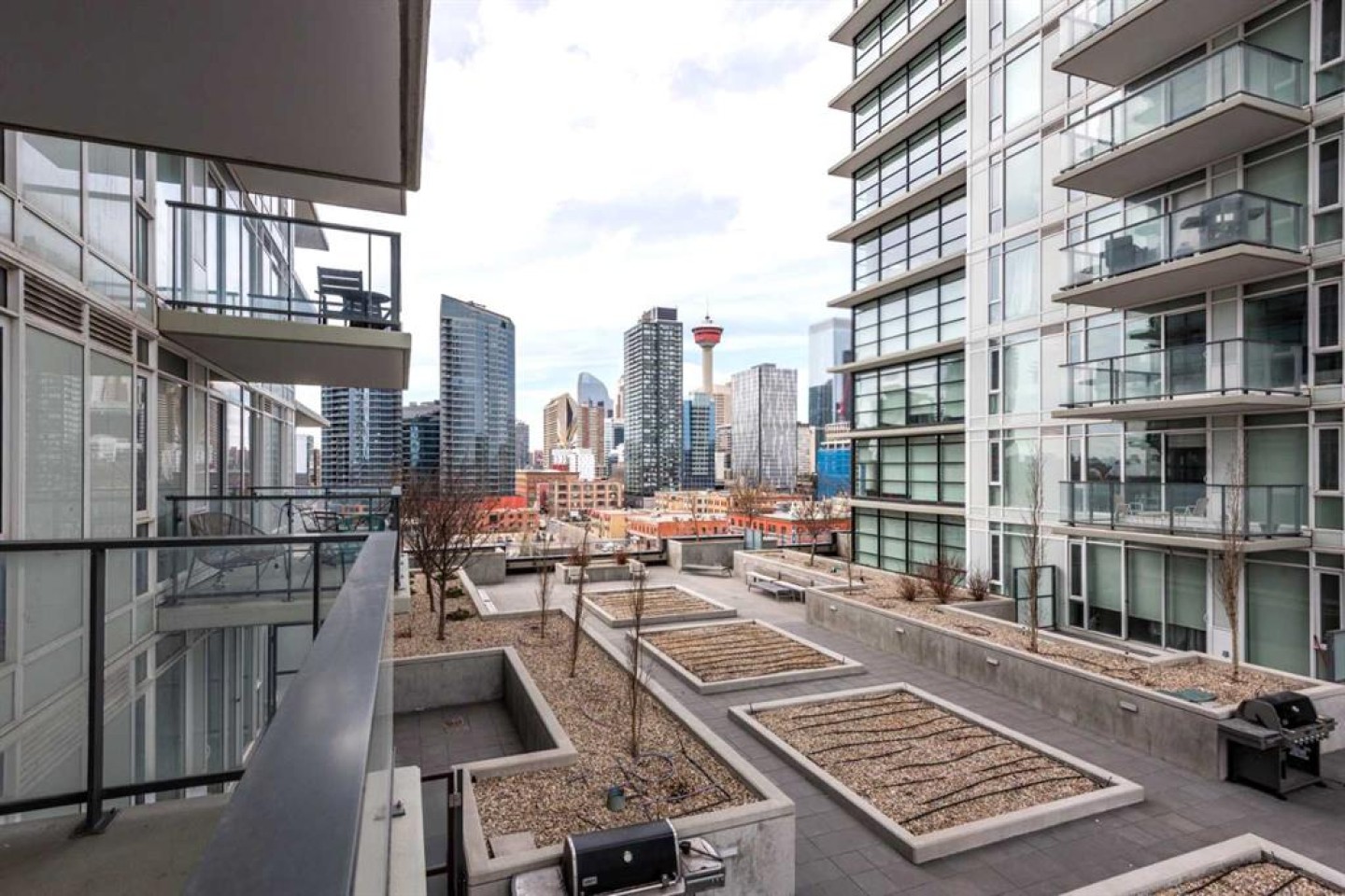 Floor-to-ceiling windows in both the living room and bedroom fill the home with natural light and showcase an open, airy layout. The contemporary European-inspired kitchen features sleek cabinetry, quartz countertops, glass backsplash, under-cabinet lighting, and a fully integrated stainless steel appliance package. Step onto your private balcony and take in impressive views of the Calgary Tower, downtown skyline, and cityscape. Additional highlights include in-suite laundry, central A/C, titled underground parking, and a separate assigned storage locker. Residents of The Guardian enjoy premium amenities: 24-hour concierge, a fully equipped fitness centre, resident lounge, garden terrace, bike storage, workshop, and pay-and-park visitor parking. Quick possession is available.