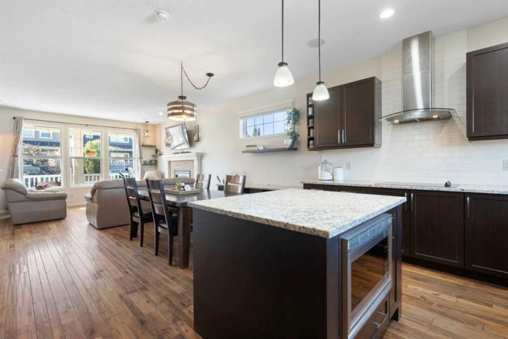 Inside, the open-concept layout creates a warm and welcoming flow, with a bright living and dining area that’s perfect for family dinners, game nights, or gatherings with friends. The kitchen is thoughtfully designed for both style and function, featuring quartz countertops, built-in appliances, a coffee bar, and plenty of counter space perfect for cooking, entertaining, and gathering with family.