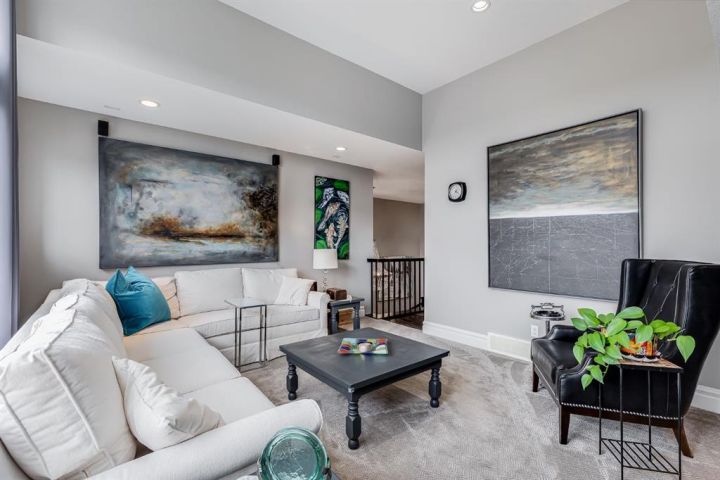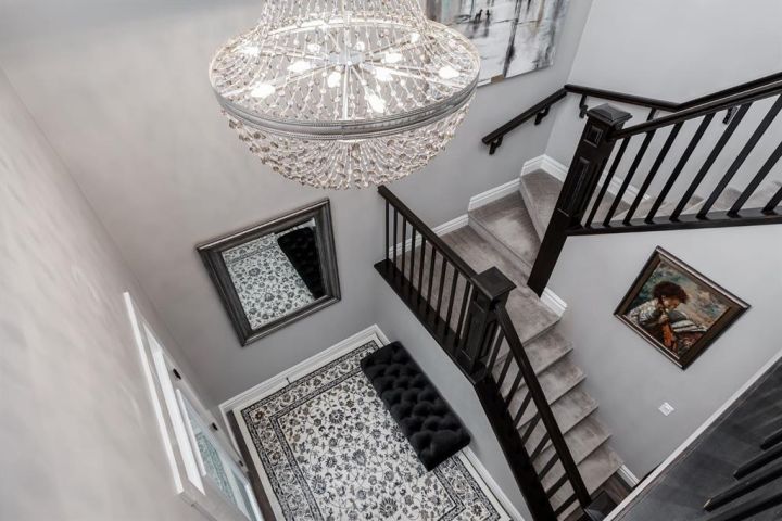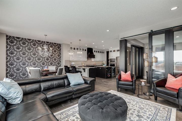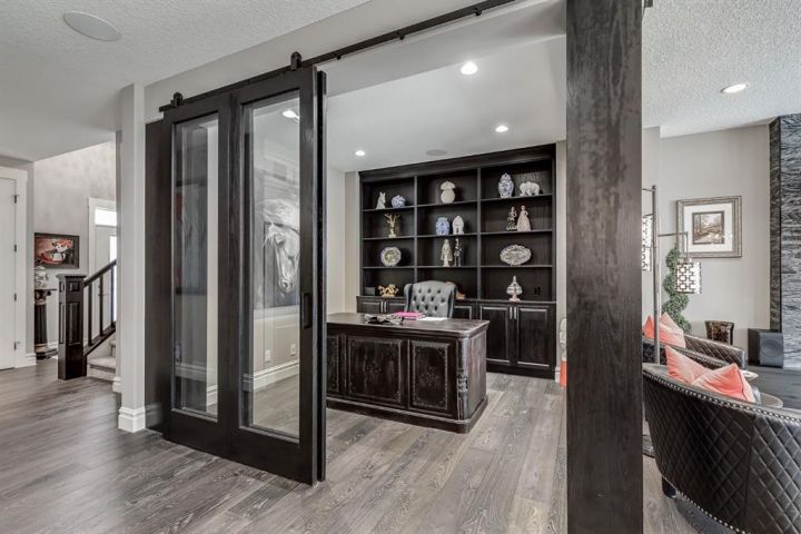 Soaring 9-ft ceilings and engineered hardwood floors create an open, airy feel. The chef-inspired kitchen boasts Ogee bevelled granite countertops, full-height two-tone cabinetry, a walk-through pantry with window, and a premium appliance package with gas cooktop, built-in oven, French-door fridge, and chimney hood fan. The adjoining dining area flows seamlessly into the sun-filled living room, anchored by custom millwork and an upgraded electric fireplace with heat blower. Additional upgrades include 8-ft doors, Heritage casings, knock-down ceilings, premium hardware, and a private den with custom glass barn doors—ideal for a home office or flex room.