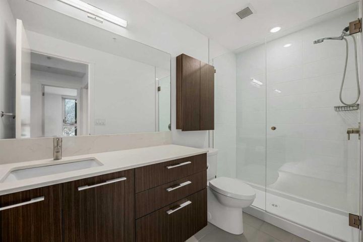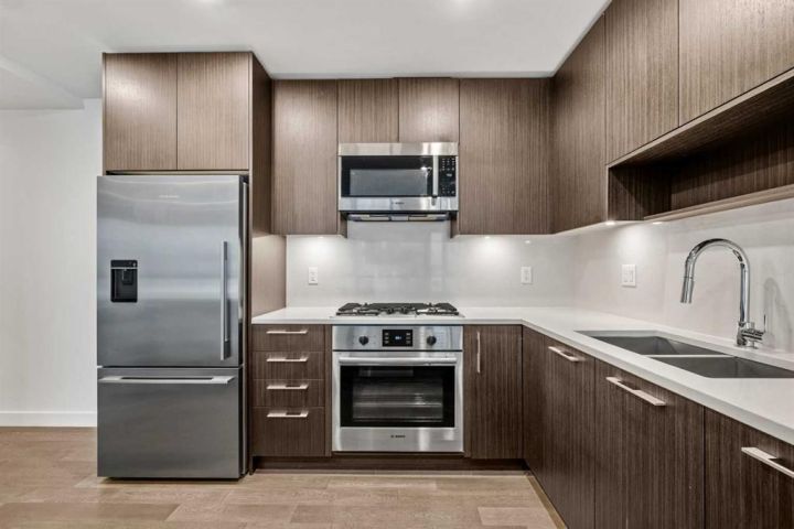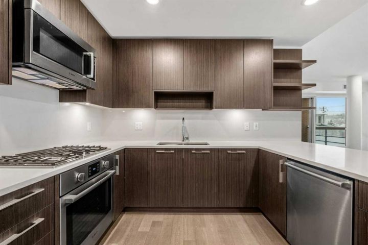 The kitchen serves as an elegant focal point, outfitted with quartz countertops, stainless steel appliances, and sleek cabinetry that offers excellent storage and workspace. Its seamless integration with the living and dining area supports both relaxed evenings at home and effortless entertaining. The private balcony extends the living space outdoors, providing a comfortable spot for morning coffee or evening unwinding.