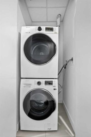 The bedroom is well proportioned, offering a calm retreat with ample closet space and easy access to the stylish bathroom, which features modern finishes and a streamlined design. In-suite laundry adds everyday practicality, making the home as functional as it is attractive.