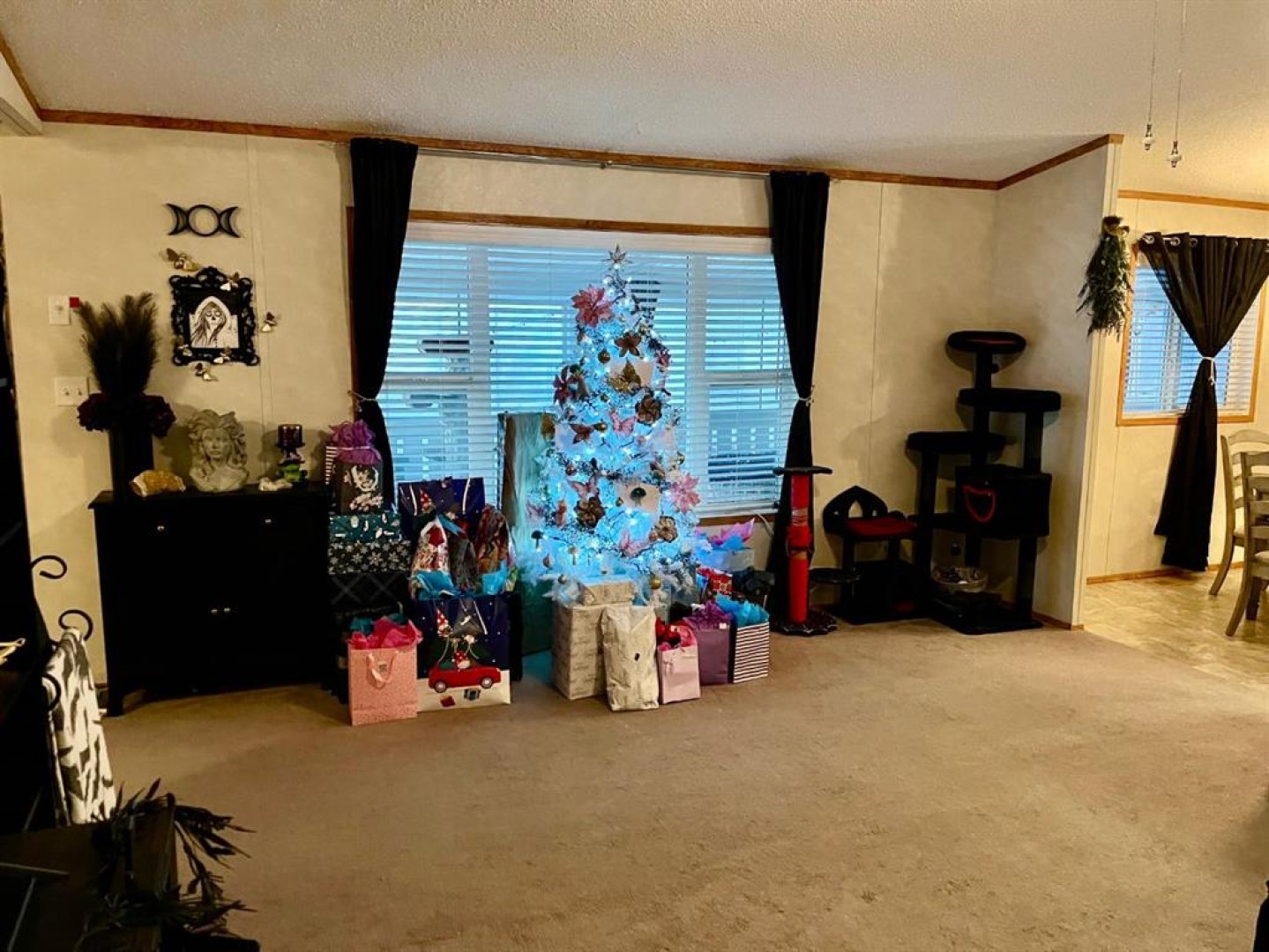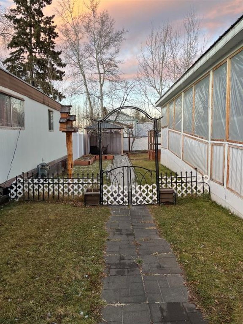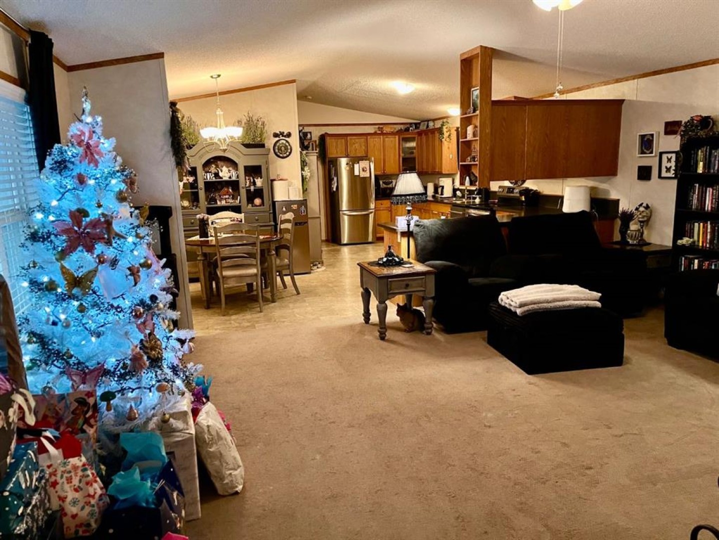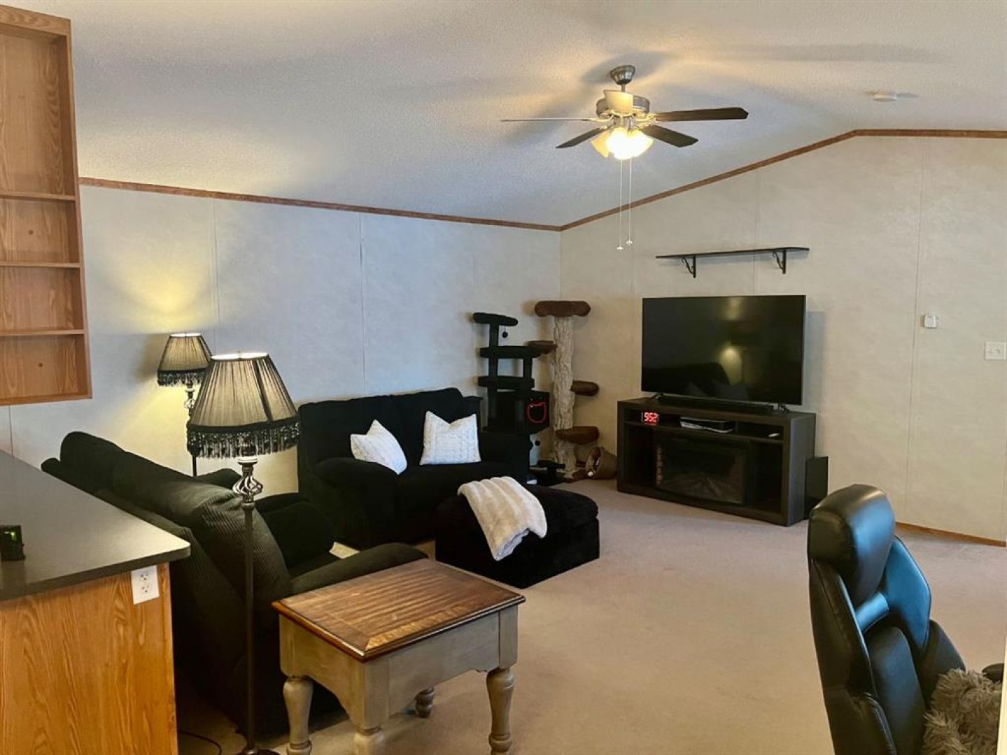Ideal home with wheel chair access. This 2012 home is 1520 sq ft. 4 bedrooms and 2 full baths, one bathroom is set-up with an easy access walk-in shower. The living room, dining room and kitchen is an open floor plan with 9 ft. vaulted ceilings. The spacious kitchen is equipped with stainless steel appliances and an abundance of cabinetry with the dining area off to the side. The living room is a comfortable area for the family to enjoy. At the one end is 3-bedrooms and a 3-pce. washroom with a walk-in shower. The other end is the primary bedroom with a 4-pce ensuite and walk-in closet. The laundry room is at the back entrance along with the furnace and hot water tank. The 12X40 deck is covered and screened in for a nice 3-season area; with a long wheel chair access ramp which carries on into the back yard to the gazebo. The 2 sheds are included with garden boxes. There is also a thriving apple tree in the yard. This home and yard shows beautifully and is neat as a pin. Water, sewer and garbage are included in the lot rent.