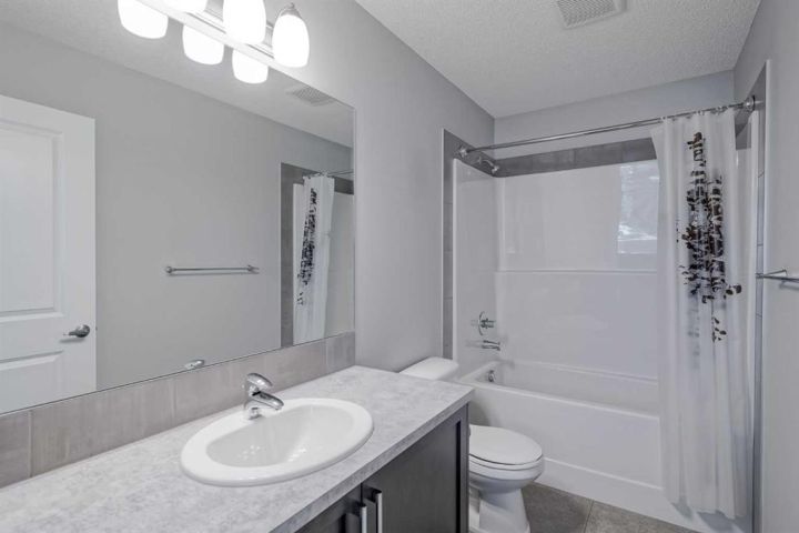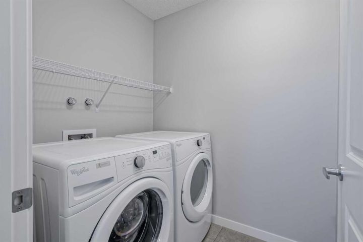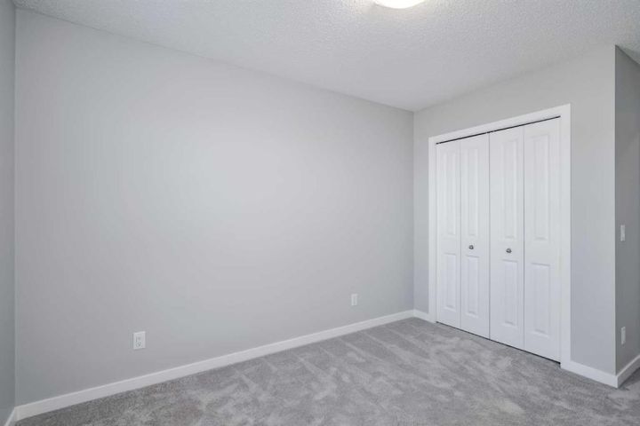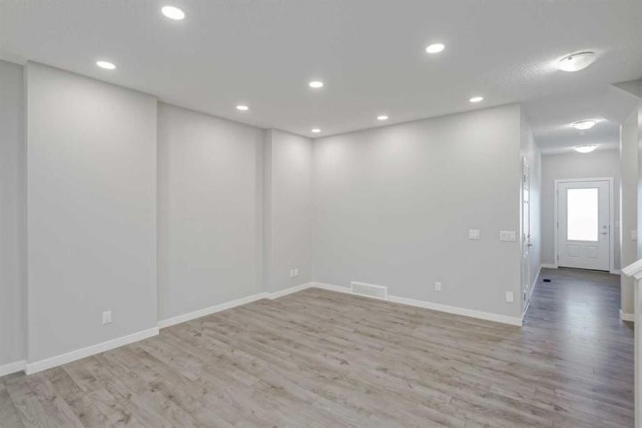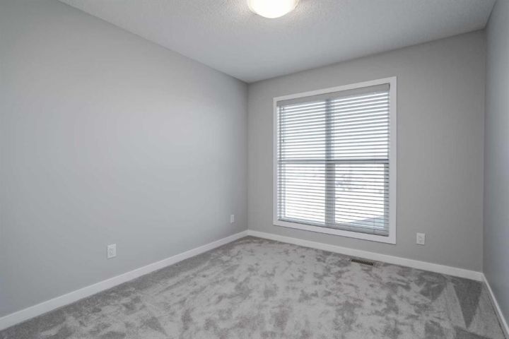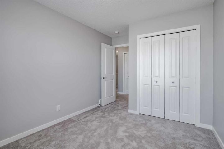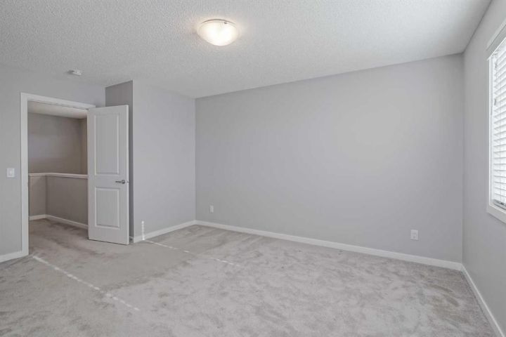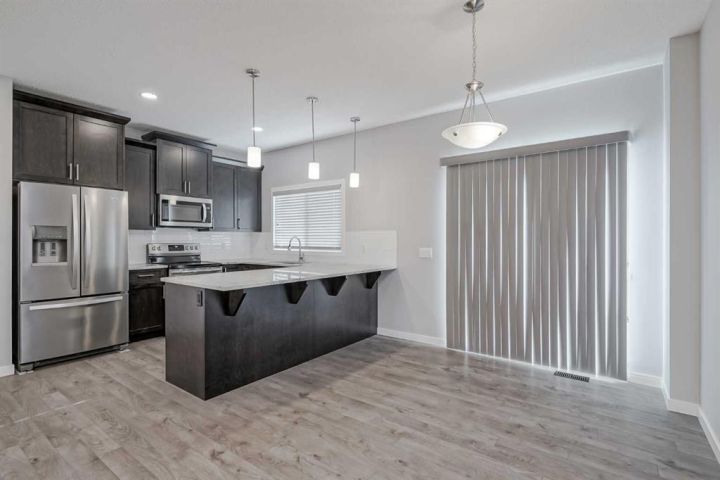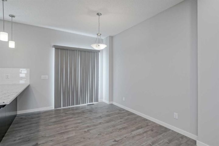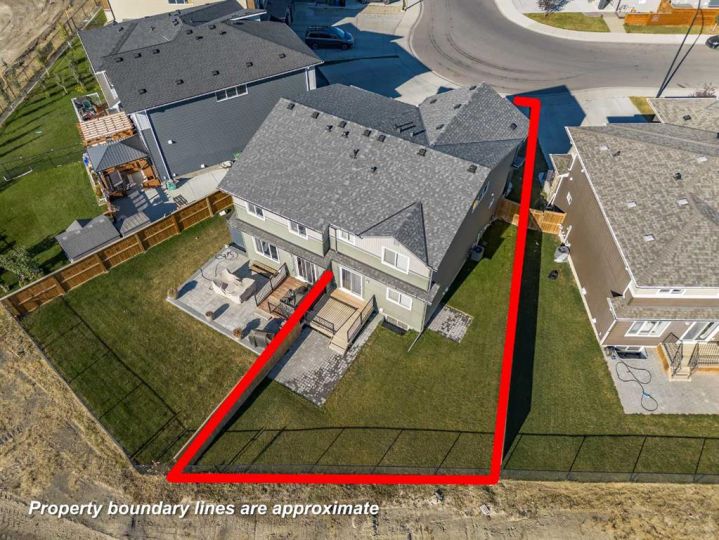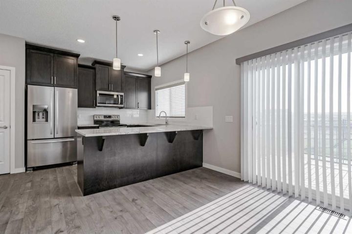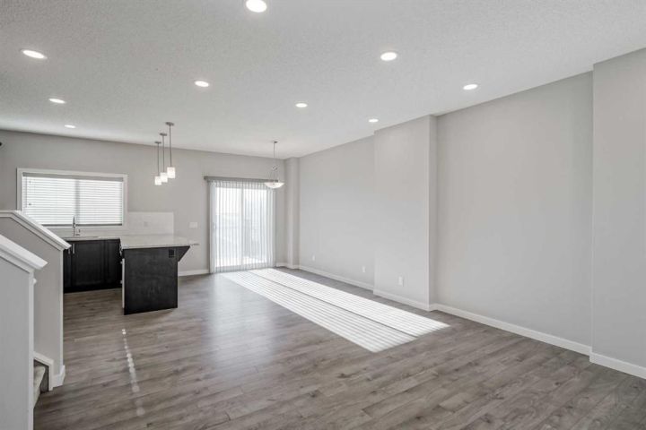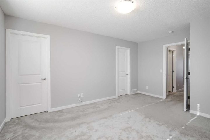 Seize this rare chance to claim a stunning half-duplex in the desirable community of Carrington—a home that delivers unmatched privacy and incredible modern value. This property immediately distinguishes itself with its unique pie-shaped lot and the huge advantage of no rear neighbors, ensuring your expansive, fully fenced backyard is a truly serene oasis. The southeast-facing yard, complete with a deck, patio, and underground sprinklers, is a spectacular setting for outdoor enjoyment and complete relaxation. Step inside and be greeted by a bright, open-concept floor plan, accentuated by soaring 9-foot ceilings and elegant Luxury Vinyl Plank flooring on the main level. The chef's delight kitchen is thoughtfully designed, showcasing sleek stainless steel appliances, premium quartz countertops, an inviting eating bar, and soft-closing drawers. This culinary hub is perfectly positioned to serve the spacious dining area, making it ideal for entertaining. Upstairs, the generous primary bedroom provides a genuine private retreat, complete with a walk-in closet and a private 3-piece ensuite. Two additional well-sized bedrooms offer abundant natural light and share a spacious 4-piece bathroom. The convenience of an upper-level laundry room makes daily chores a breeze. Enjoy year-round comfort with central air conditioning and the convenience of an insulated attached garage. The full and unfinished basement is a blank canvas, offering endless potential and featuring rough-in plumbing for a future bathroom. Nestled in a fantastic community with easy access to shopping, parks, and major routes like Stoney Trail, this home is the perfect combination of modern living, privacy, and future potential. Priced to sell, this exceptional residence is a smart investment—schedule your showing today!