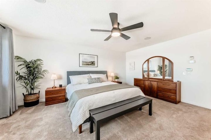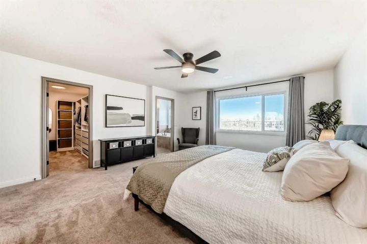 This spacious and beautifully updated 3-bedroom home offers over 3,200 sq. ft. of bright, open living space, featuring an attached garage, lake access, and a fully finished walkout basement backing onto a tranquil pond. The main and upper levels feel expansive with new plank flooring, premium carpet and underlay, fresh modern paint, upgraded LED lighting, stylish fixtures, and sleek black hardware. The generous kitchen boasts granite countertops, a large pantry, new appliances, soft-close hardware, and an upgraded island. Upstairs, the luxurious primary suite includes a 5-piece ensuite and a walk-in closet with a custom organizer, while the upper level also provides convenient laundry. Mechanical upgrades include a new 75-gallon hot water tank and water softener. The exterior extends your living area with a rebuilt upper balcony with new structure and railings, a wide lower deck, a spacious brick patio with roughed-in connections for a hot tub, a welcoming fire pit area, custom planters, improved drainage, and a new shed. An elegant move-in-ready walkout home offering abundant upgrades, generous living spaces, and serene water views.