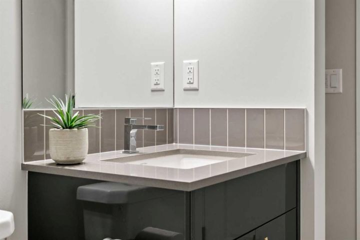 The main bathroom is perfect for a family. The vanity and extra shelving have plenty of space.