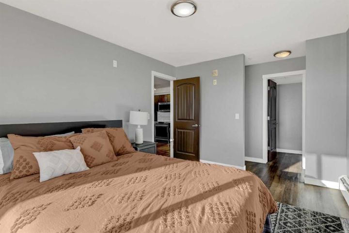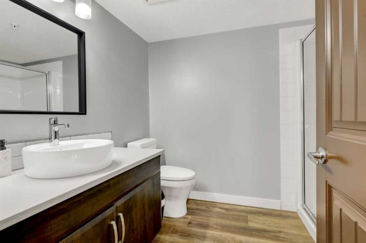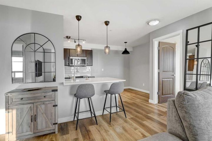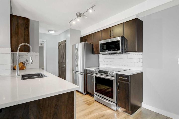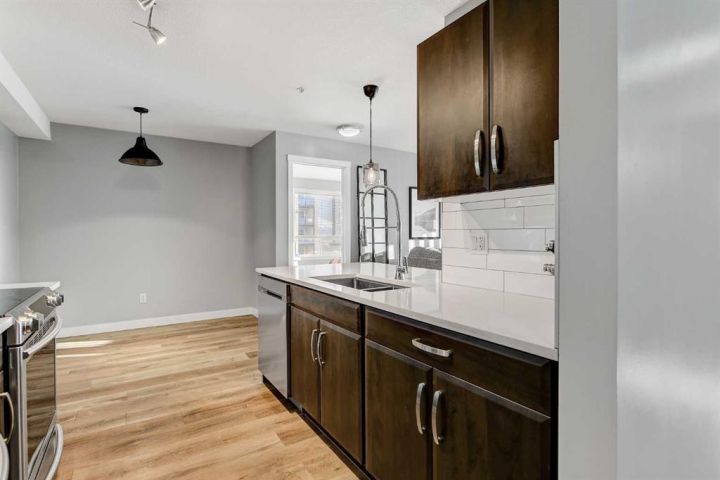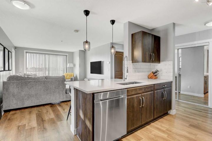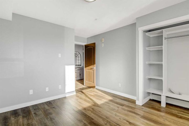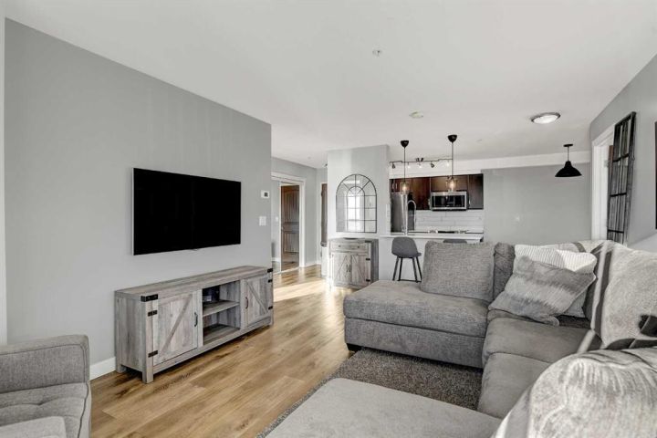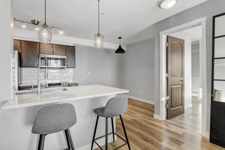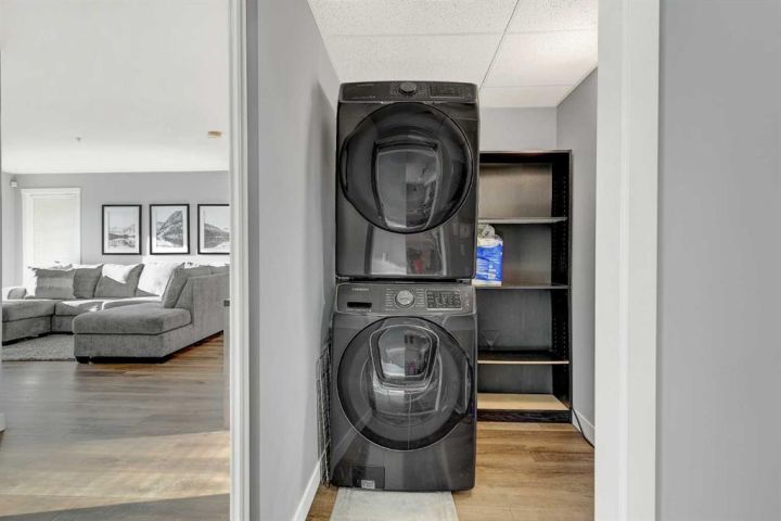 Check out this beautifully renovated corner-unit condo in Aurora Estates! Located on the second floor, this 2-bedroom, 2-bathroom suite is perfect for both homeowners and investors. Enjoy a double-wide covered balcony, a secure heated underground parking stall, and a long list of high-end upgrades includes new Samsung stainless steel kitchen appliances, a newer dark grey Samsung stacked washer/dryer, stunning Hanstone quartz countertops, an undermount kitchen sink with an industrial faucet, an in-sink garburator, updated tile backsplash in the kitchen and bathrooms, new bathroom sinks, faucets, and toilets, modern trim, fresh paint throughout, new vinyl plank flooring, upgraded light fixtures with LED bulbs, new patio door blinds in the living room and primary bedroom, and elevated power outlets for wall-mounted TVs or accent lighting. Few units in this complex have been upgraded to this level—this one truly stands out!