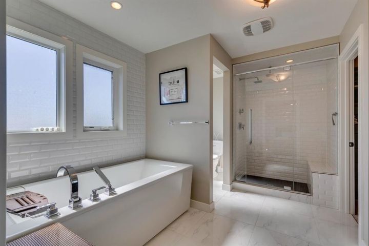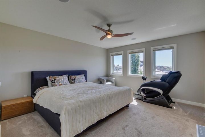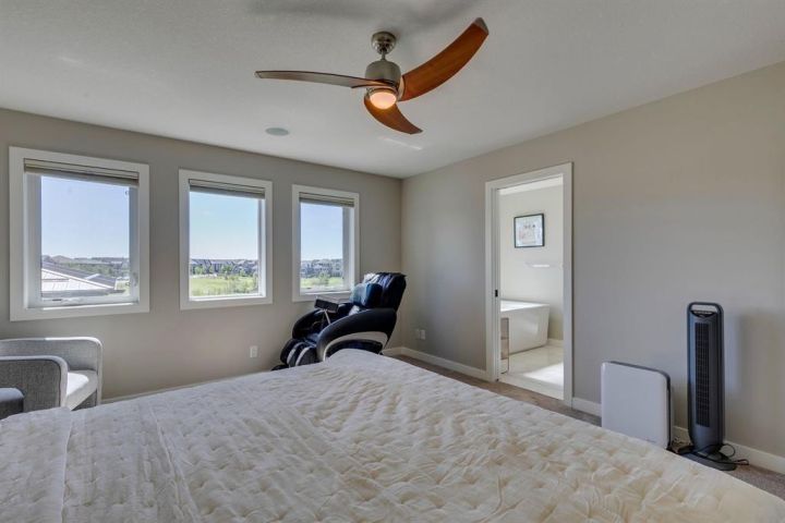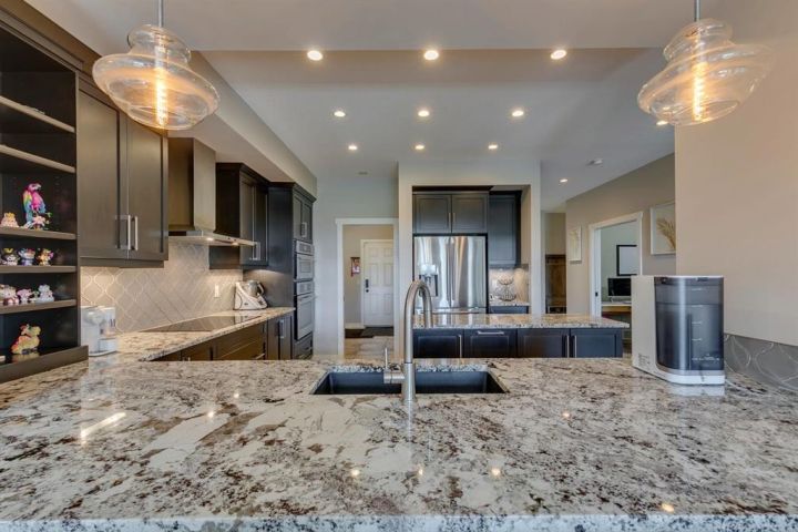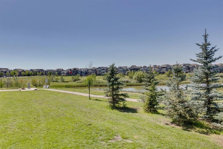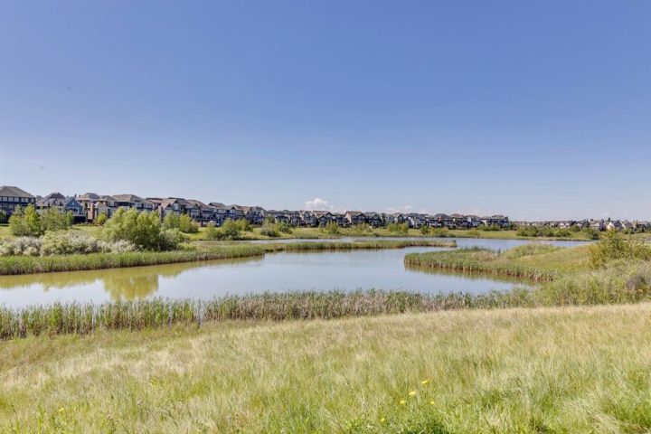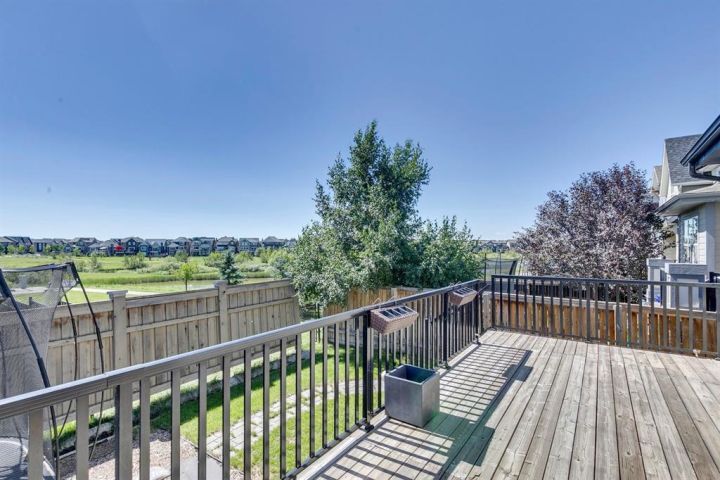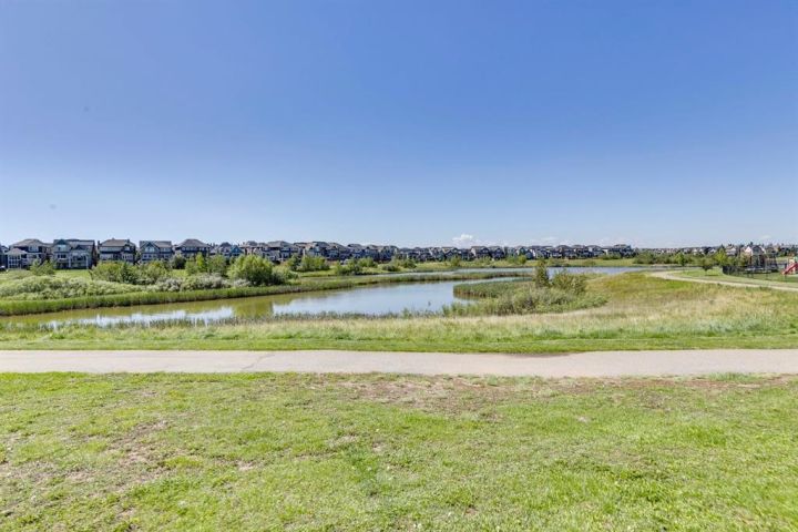 TRANQUIL VIEWS OF THE POND | FULLY DEVELOPED 5 BDRM HOME WITH AN ABUNDANCE OF UPGRADES | NO NEIGHBOURS BEHIND YOU | This gorgeous home is nicely located on a quiet street, featuring a south backyard with no neighbours behind you & has a long list of fabulous upgrades! The main level, bright with an abundance of natural light, welcomes you in to a large foyer with oversized tile flooring & opens to a spacious & inviting floorplan. The gourmet kitchen showcases a ceiling detail bulkhead, full height cabinetry in a rich dark tone that is contrasted with the soft, neutral arabesque custom tile backsplash & elegant granite countertops. The stainless steel appliances include a sleek ceramic cooktop & built-in oven & microwave; there is a central island as well as a peninsula style island making this kitchen not only stunning but also highly functional…plus there is a walk-through pantry! The peninsula island offers an eating bar & overlooks the large dining area that opens to the sunny backyard. Finished with beautiful hand-scraped hardwood flooring throughout the living & dining areas, while the living room features a stylish gas fireplace with raised hearth…this space is warm & inviting, creating a perfect atmosphere for quiet family time or entertaining guests, offering views of green belt & pond! Completing this main level is a private den with sliding pocket doors. Upstairs is sure to please as well…there is a generous sized bonus room with built-in dry bar with beverage fridge; the sliding barn door creates an ideal separation for the “kid’s area” where you will find 3 bedrooms, separated by a 5pc bathroom with dual sinks, as well as a built-in homework station! The Master bedroom, located at the rear of the home, offers fantastic views of the pond & has a lovely spa-like ensuite…freestanding bathtub with a modern full height subway tile feature wall, dual vessel sinks, & custom tiled shower with 10mm glass…plus a walk-in closet with custom built-in organizers! You will enjoy the convenience of the upper laundry room with expansive counter space & lower cabinets! The lower level, professionally finished, is host to a huge open family/rec room, 5th bedroom & full bathroom. This home is also wired with in-ceiling speakers on all 3 levels, central A/C…plus it is pet-free & smoke-free! The south backyard can become your private oasis…fully fenced & landscaped with a full-width skirted deck, no neighbours behind you & direct access via your private gate out to the pathway system! Enjoy this amazing home in a desirable 4 season community that offers great access, endless shops, restaurants & services…plus nearby community schools!