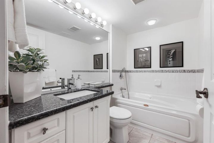 The gourmet kitchen features white European cabinetry, granite counters, stainless steel appliances, ceramic tile flooring, and a convenient breakfast bar that opens to the main living space. The second bedroom offers smart versatility and can easily function as a home office or private den.