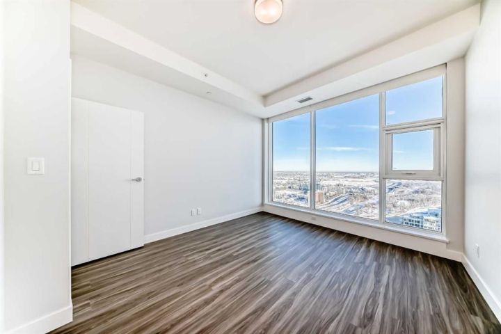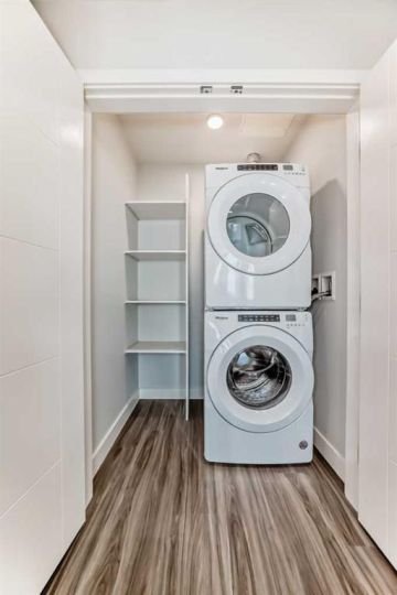 As you step through the entrance, a welcoming foyer ushers you in, providing easy access to your front closet and in-suite laundry. Moving into the expansive main living area, you're greeted by floor-to-ceiling windows that reveal a panoramic spectacle. The open-concept layout features large kitchen, dining, and living spaces, all adorned with premium finishes, including abundant pot lights and wide plank flooring.