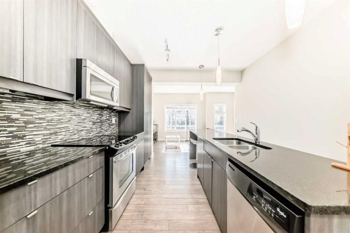 Welcome to this charming 2-bedroom plus den townhouse nestled in the picturesque lake community of Mahogany! Perfect for investors, first-time buyers, or those looking to downsize, this home showcases a modern open-concept design with 9-foot ceilings that seamlessly connect the living room, dining area, and chef’s kitchen. The kitchen is a standout, featuring sleek granite countertops with an extended island, stainless steel appliances, pantry, and ample storage. Step out onto the sunny balcony with gas line, ideal for barbecues and evening sunsets.