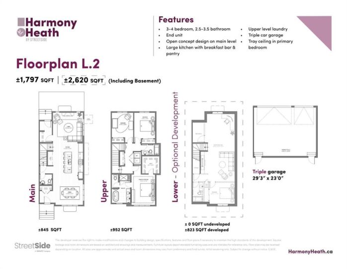 Nestled in the heart of Harmony (An eight-time “Community of the Year” award winner), home offers more than just incredible design; it’s a gateway to an extraordinary lifestyle. Enjoy exclusive perks at Mickelson National Golf Club, practice your swing at the Launch Pad’s interactive driving range, unwind at the beach, or paddle across the stunning 40-acre lake. The community offers something for every pace of life, from fly fishing and community gardening to 17kms of paved pathways, a skate park, or beach volleyball! And there’s even more on the horizon. Harmony will soon welcome: a second 100-acre lake, Phase 2 of the Adventure Park (hello tennis/pickle ball courts!), and the highly anticipated village core filled with boutique shops, restaurants, salons, galleries, and even a Nordic Spa! But if you’re craving a change of scenery, the Rocky Mountains are just a short 45-minute drive away. Inside, this 3-bedroom, 2.5-bathroom home is designed to impress. With 8’ and 9’ knockdown ceilings, triple-pane windows, and a durable Hardie board exterior, this home combines comfort and efficiency. Luxury vinyl plank flooring is featured throughout the upper two levels, while the gourmet kitchen boasts Bosch appliances, a stylish wine bar, and elegant finishes. The open-concept living area includes a cozy gas fireplace with ribbed tile detailing, creating a warm and inviting space. Upstairs, the primary suite boasts a spa-like 5-piece ensuite with a freestanding tub, and the upper-floor laundry room is thoughtfully designed for convenience and function.